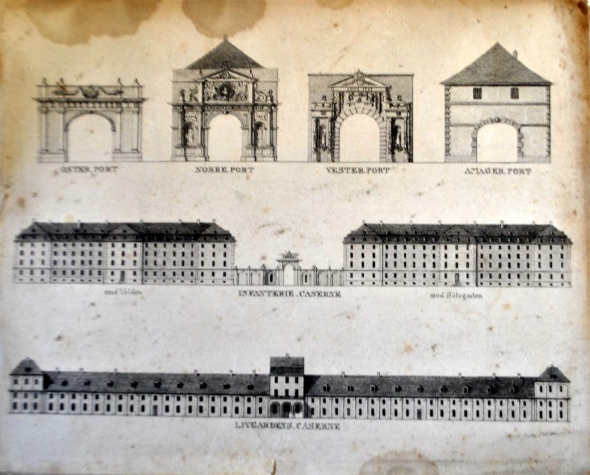 Lithograph, 19th century Copenhagen. With Østerport, Nørreport, Vesterport, Amagerport, Infanteri Kassernen and Livgardens Kasserne. 18.5 x 23 cm.