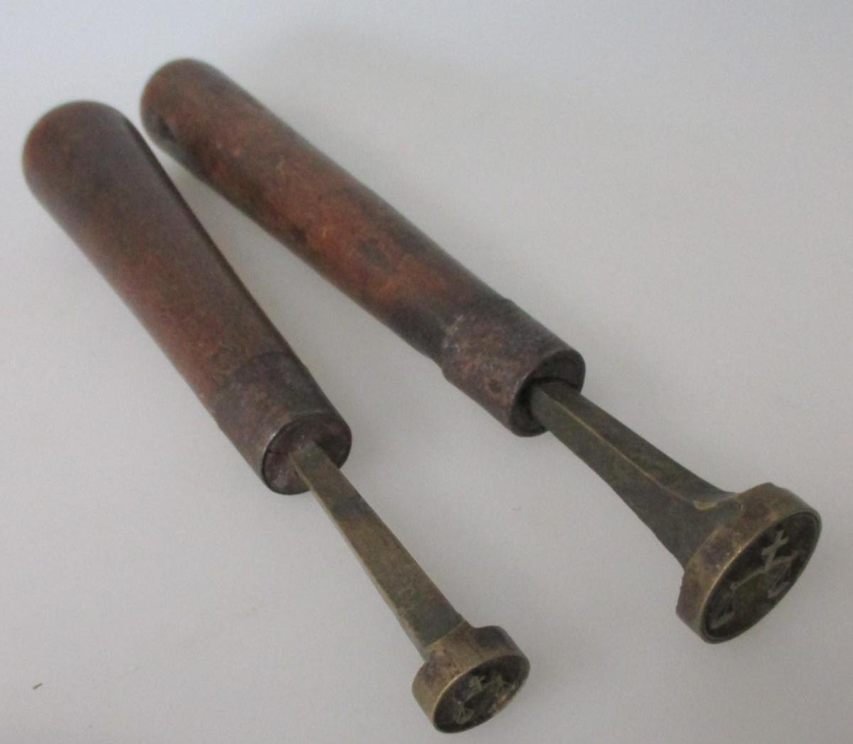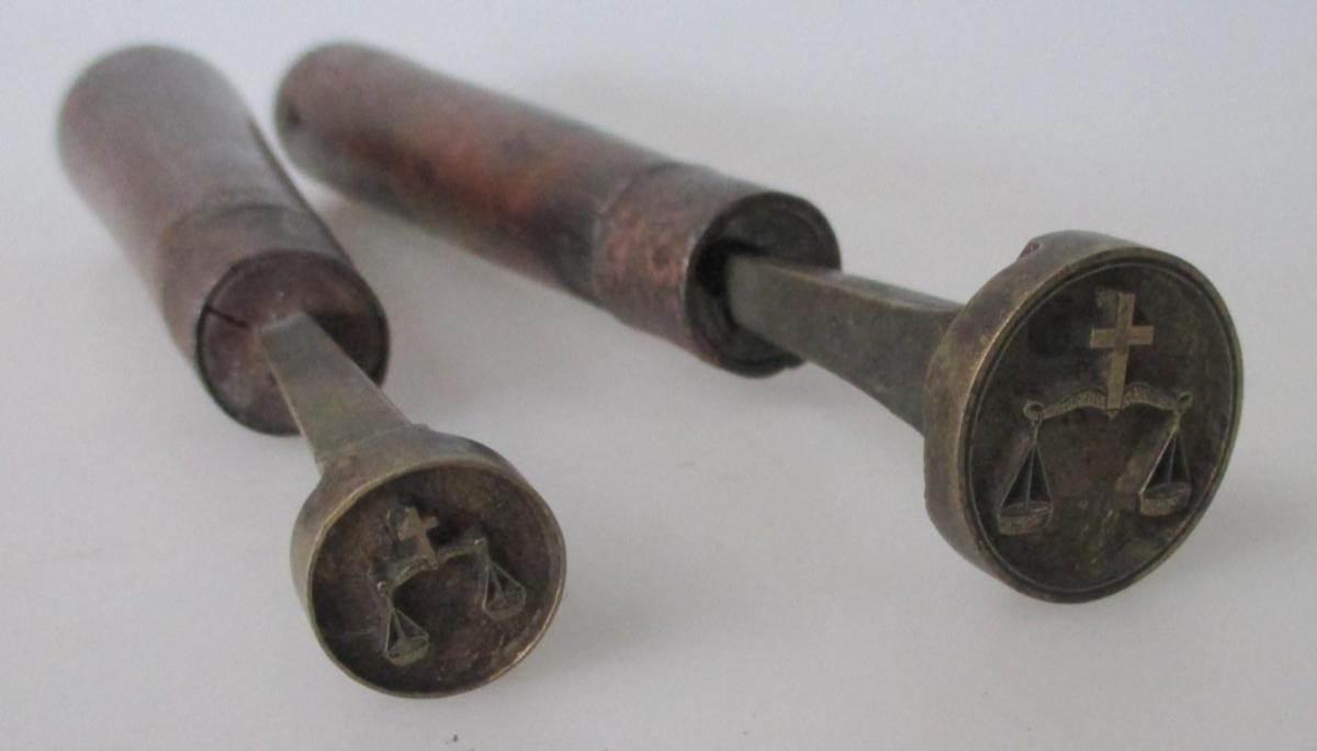 Skaft af træ, mellemstykke af jern og stempelstykke af bronze. Præget med vægt og kors. L.:16 - 19 cm.