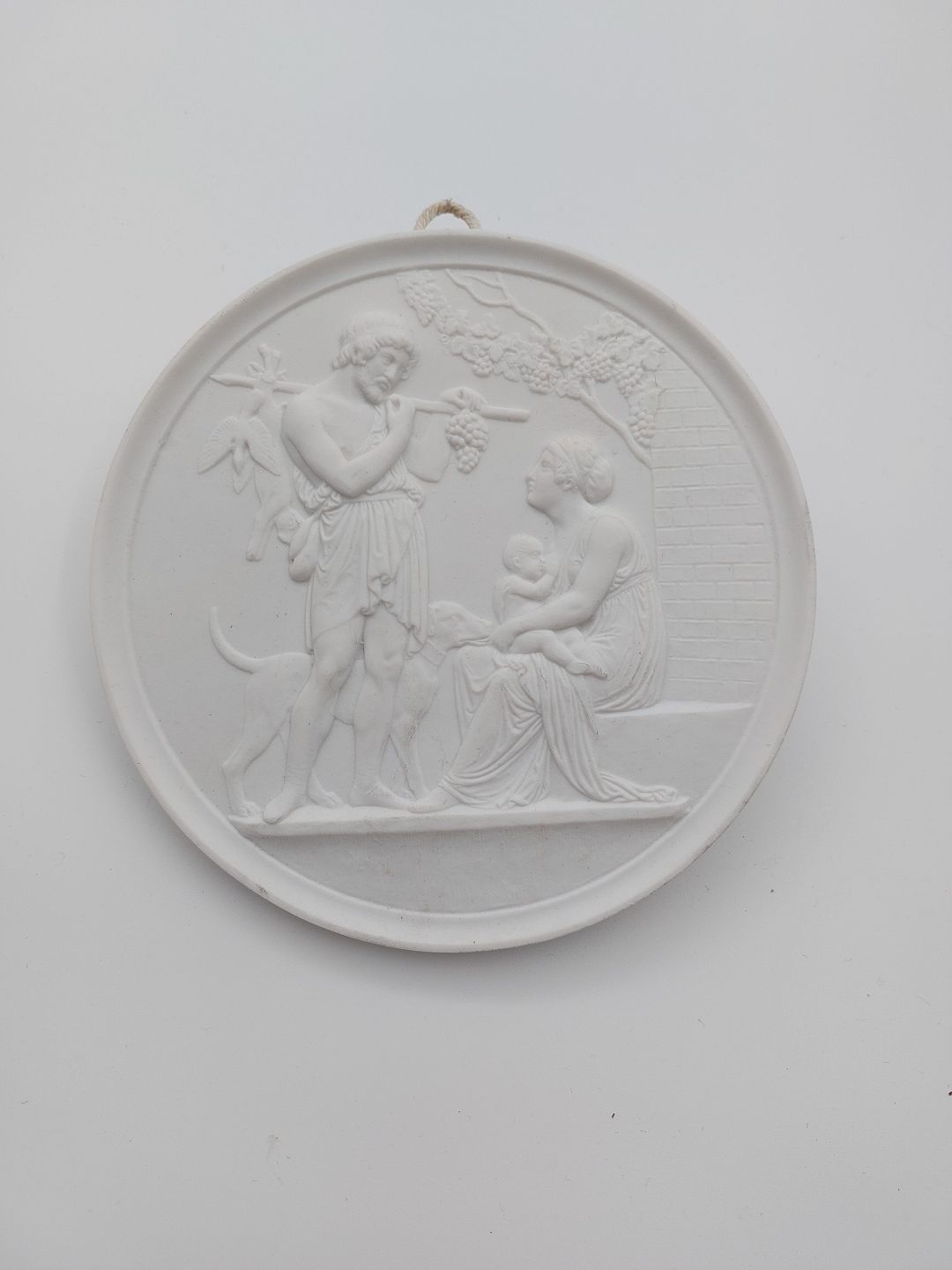 Bertel Thorvaldsen: Bing and Grondahl bisquit plate "Manhood and autumn" After relief modeled in Rome 1836. Measures 14.5cm (5.70 inches). Made in the late 19th century.