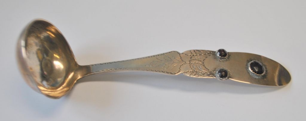 Sauce spoon in silver with three glass stone, 1834, Sønderjylland, Denmark. Unidentified master mark: AA. Length: 16 cm. Handle engravings in the form of flowers.