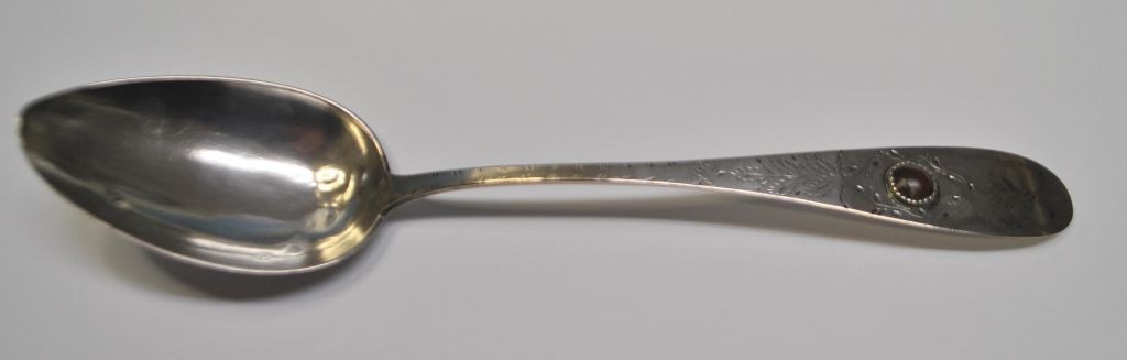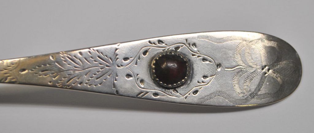 Silver spoon with red glass stone, Holstein, 1834, Germany. Stamped: E. Handle with engravings. Verso engraving: Zum Andenken Von Marten Schaade. L .: 21.5 cm.