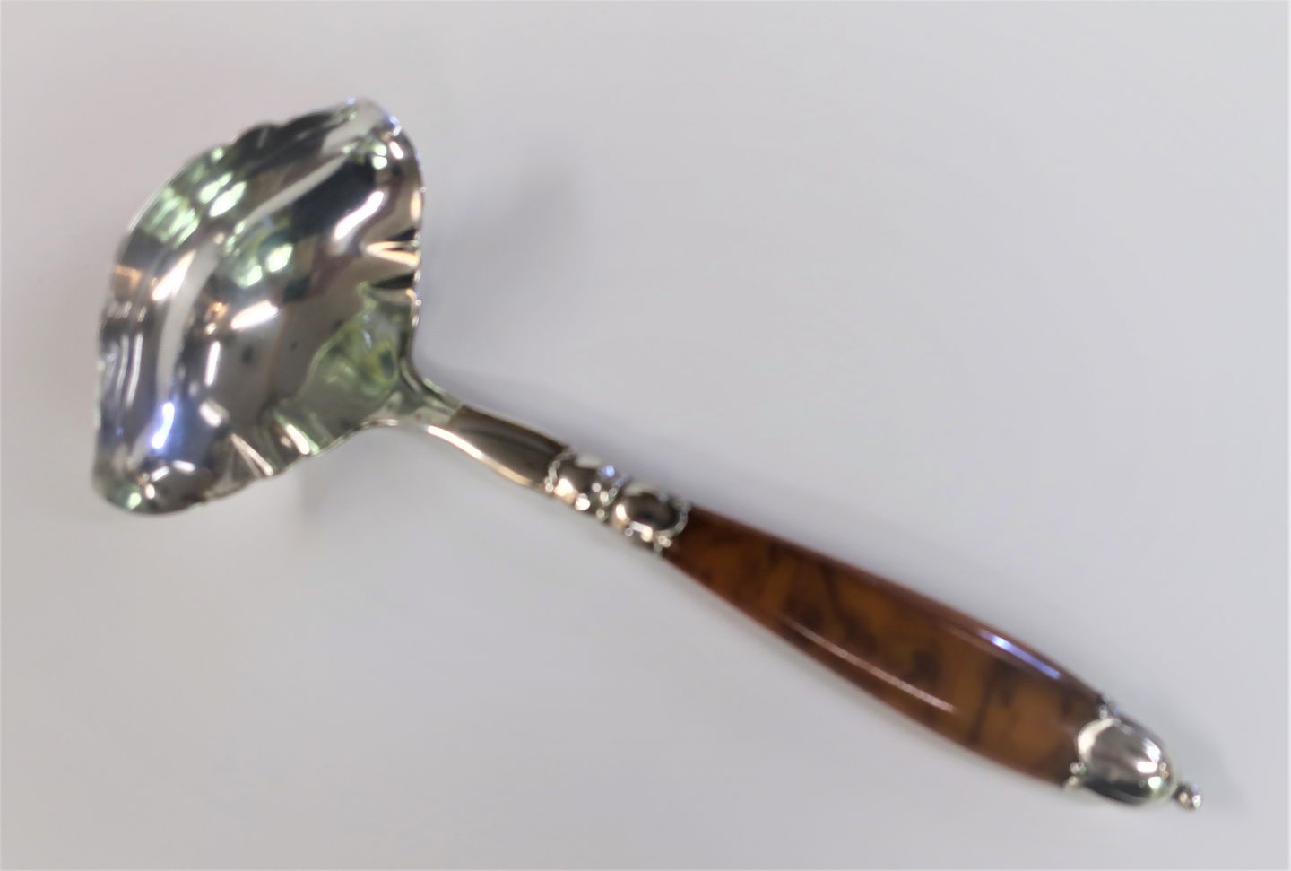 Sølv sovseske med kunst rav. (830). Længde 20 cm. Produceret 1928
