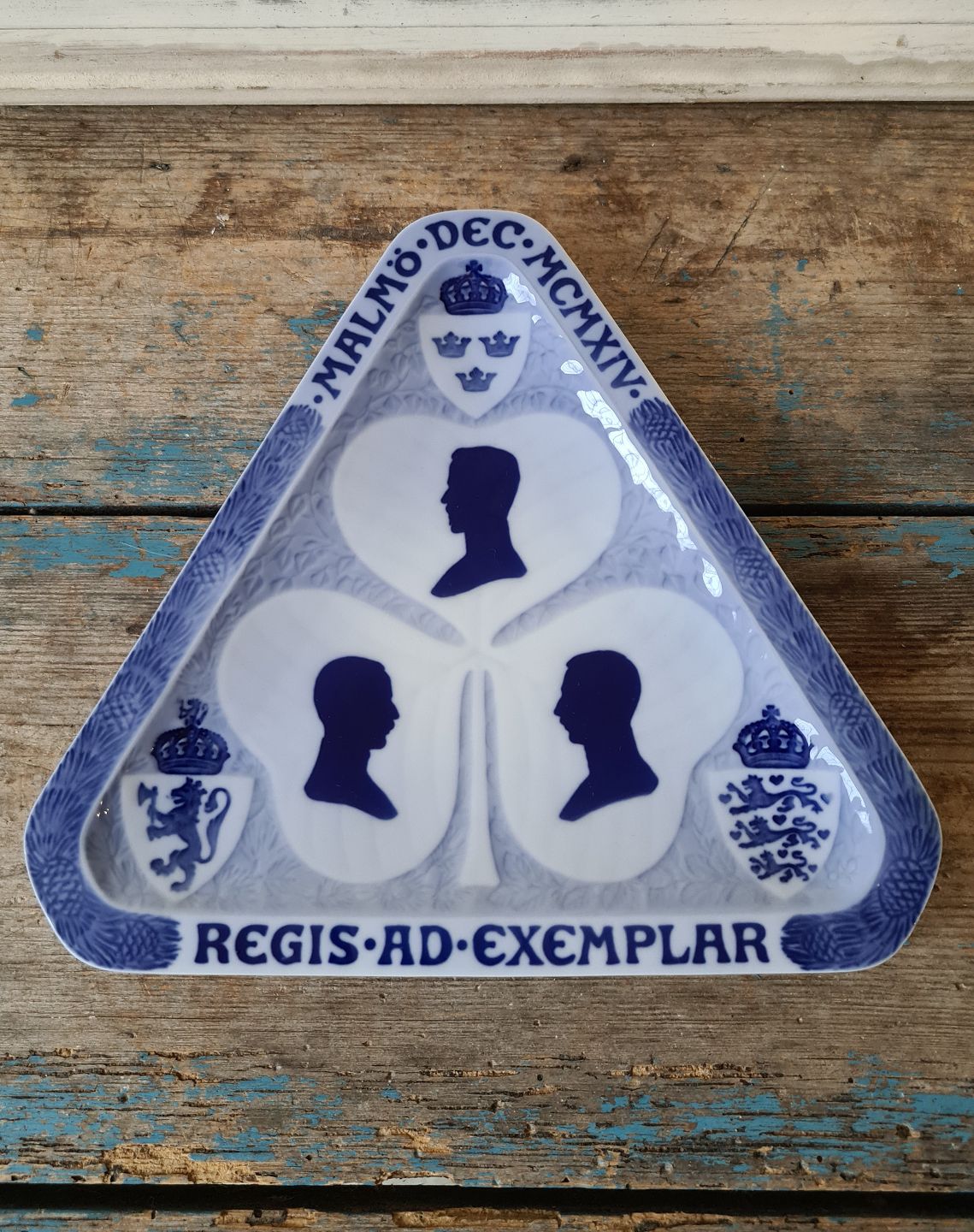 Trekantet platte med silhuetter af Kongerne Gustaf V, Haakon VII og Christian X samt det danske, norske og svenske Rigsvåben.
