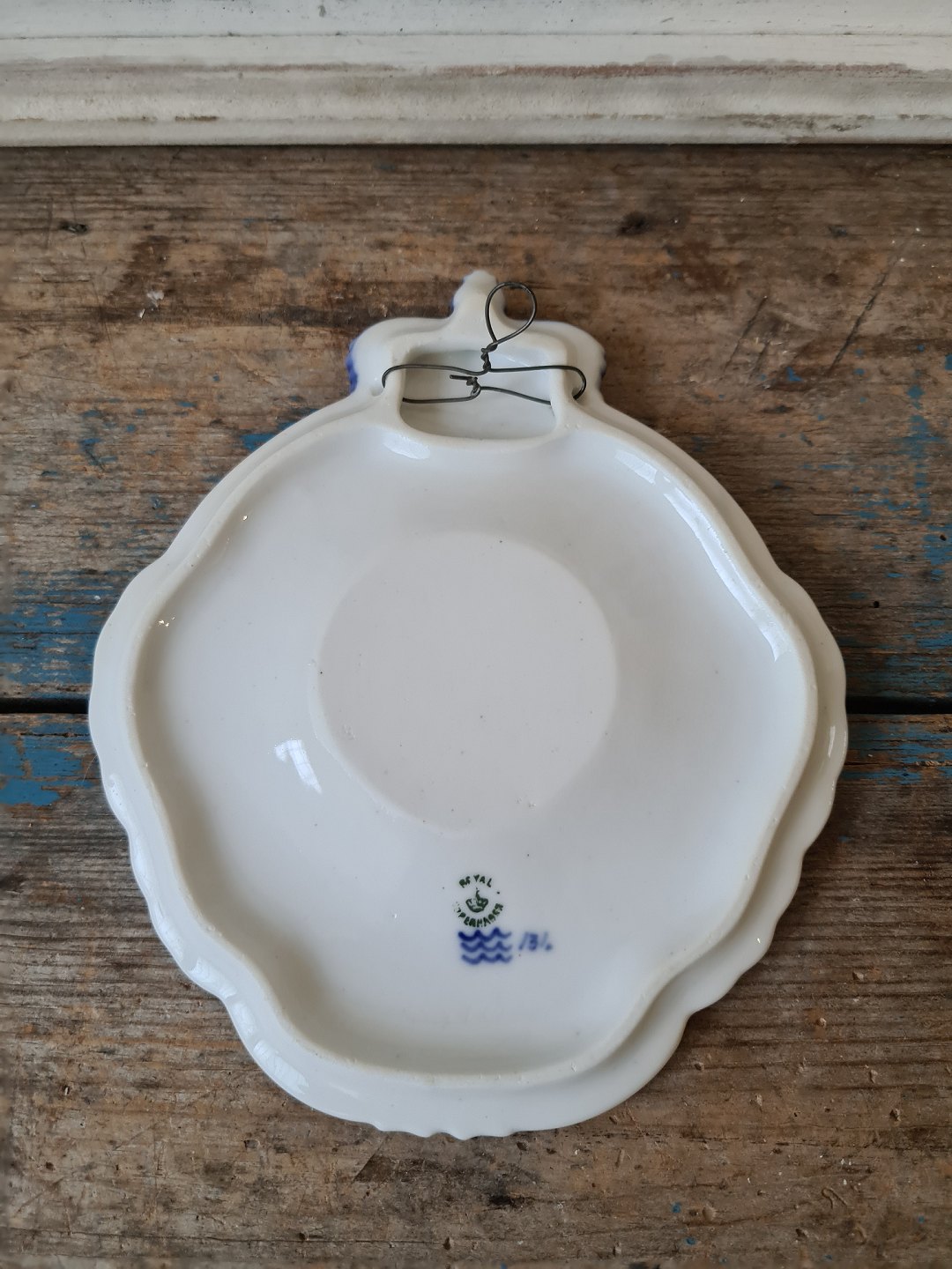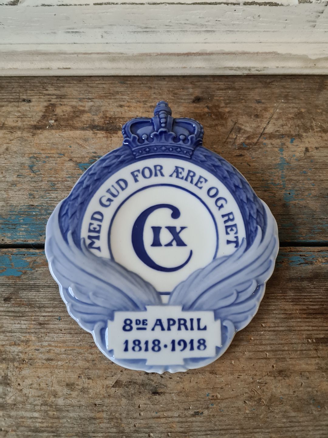 Royal Copenhagen mindeplatte i hundredåret for Christian IX´s fødsel. Krans med krone og bladværk. Indskrift: med gud for ære og ret C IX 8de april 1818-1918