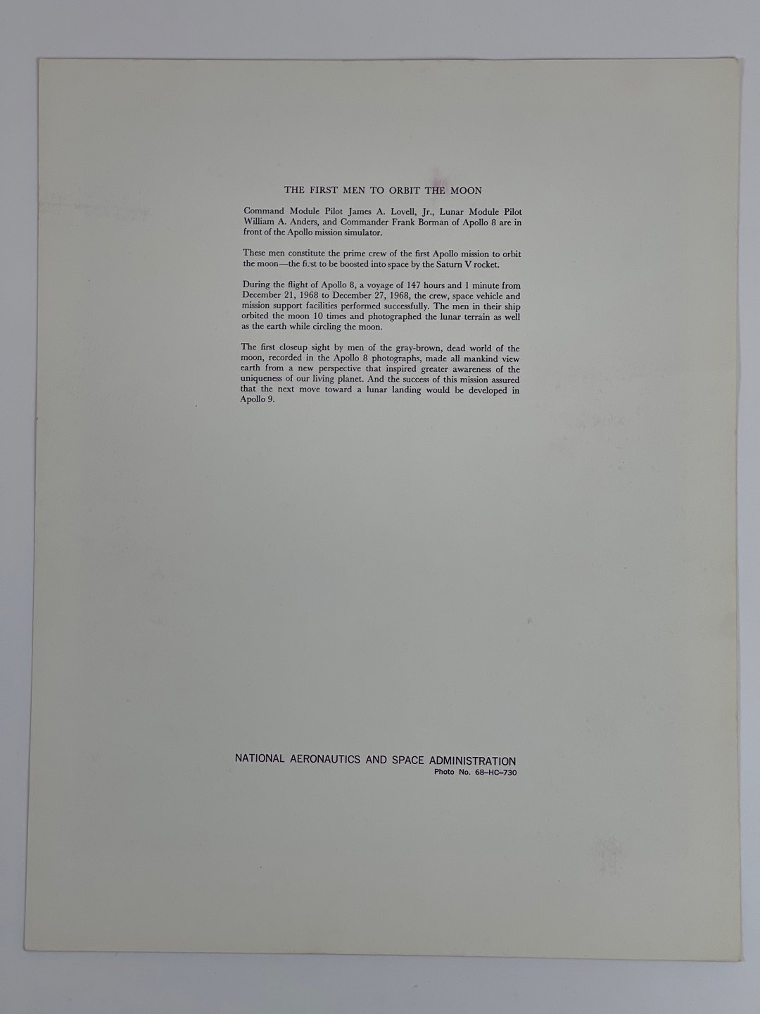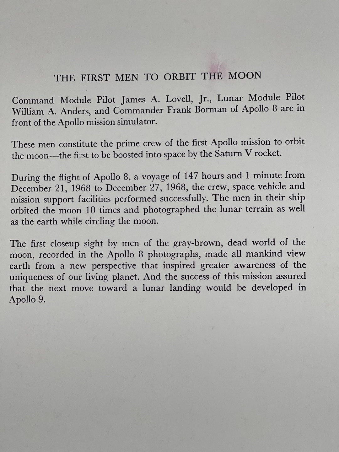 Vintage NASA farveoffsetfoto / fotoplakat / fotoprint af James Lowell Jr., William Anders og Frank Borman - Apollo 8 rumfartøjets mandskab i 1968.