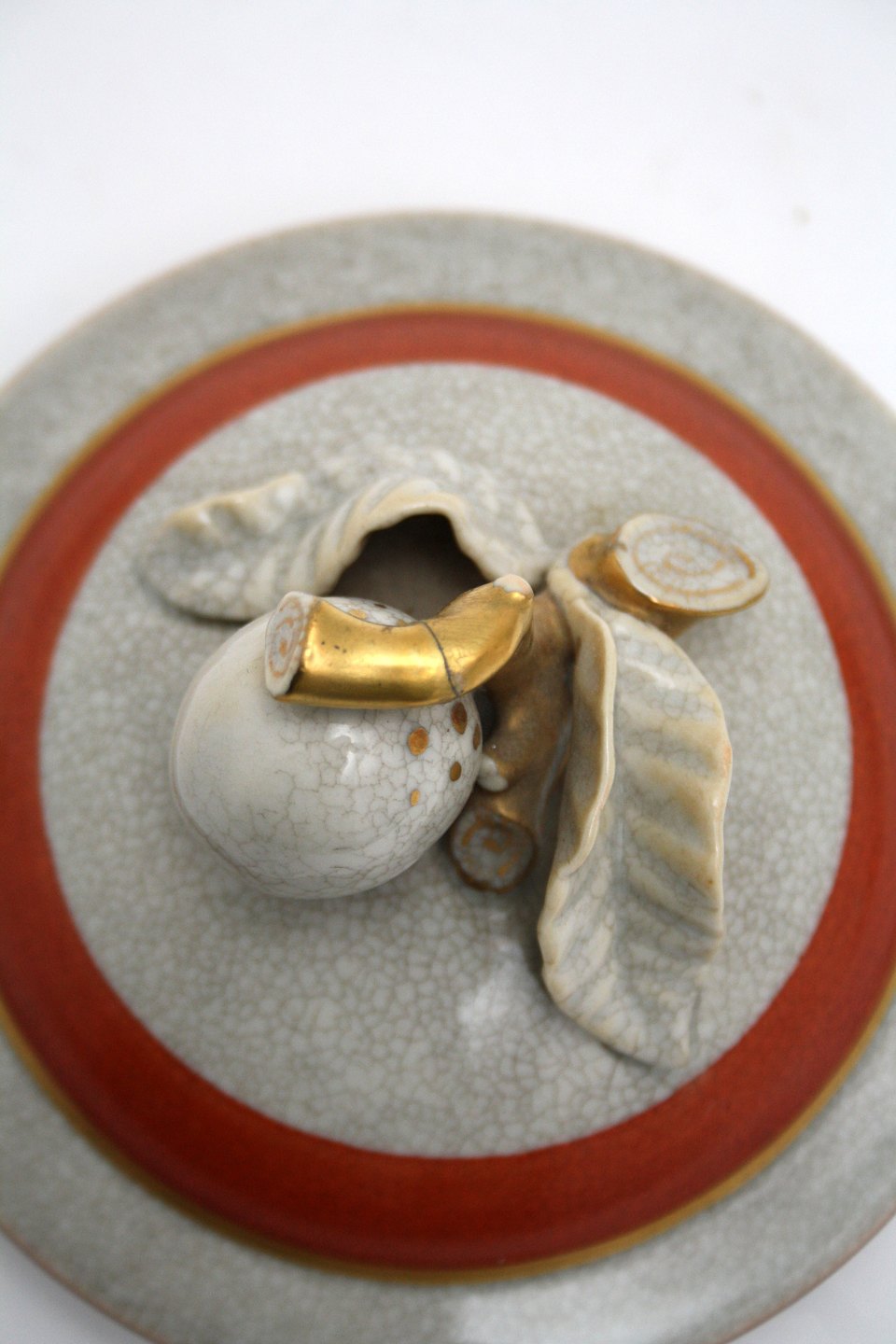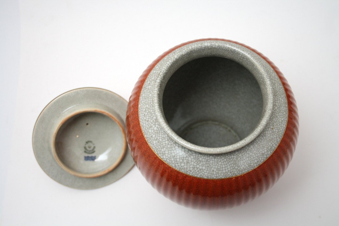 Royal Copenhagen, Krakelé urne med repareret låg, kan også bruges som en rigtig flot vase. Nr. 212/2781. Højde med låg 24 cm. Låget er repareret på stilken af guld. Største diameter ca. 16 cm. Pris: 850 kr.