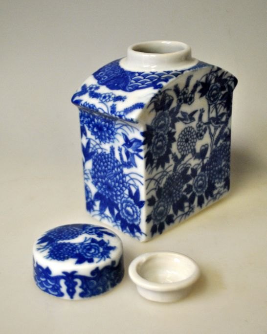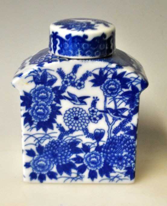 Japansk te dåse i porcelæn, 20. årh. Blådekoreret med fugle og blomster i transfer teknik. Med to låg. Stemplet. H.: 11 cm.