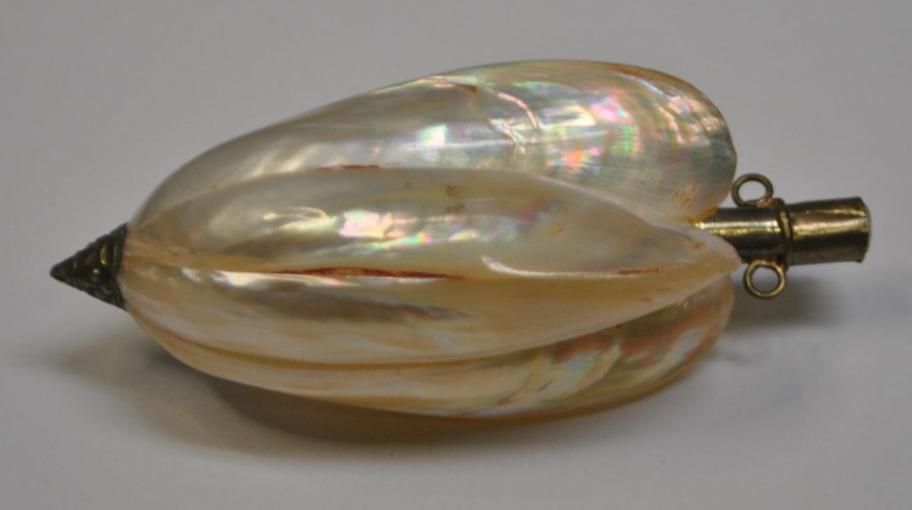 Perfume container, made in seashells, 19./20. thC.  Length .. 10 cm.