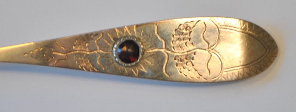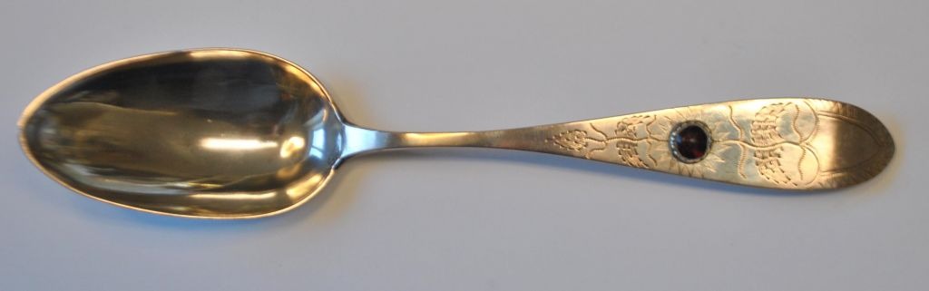 Sølv ske med rød glasflus og dekorationer, Slesvig Holsten, 1841. Stemplet: T. Verso indgravering: J. Diechmann 1842. Længde.: 22 cm.