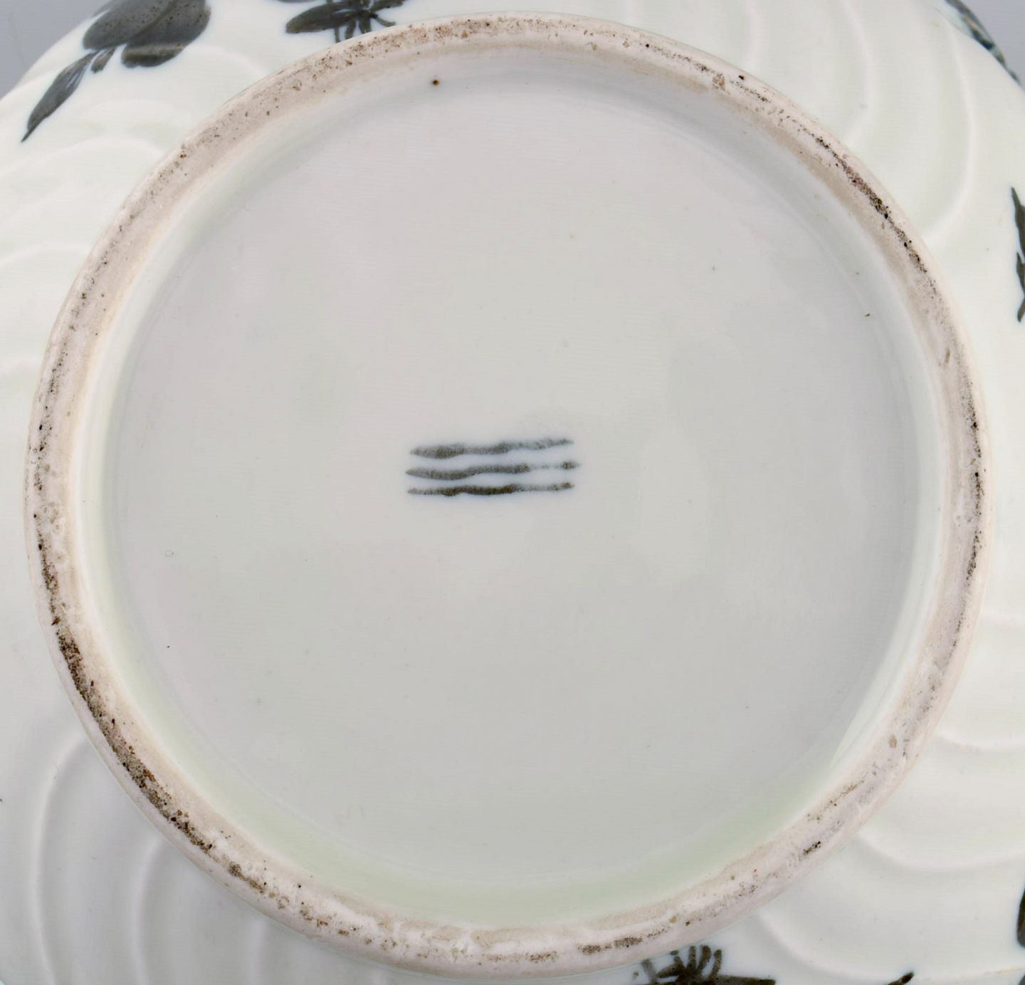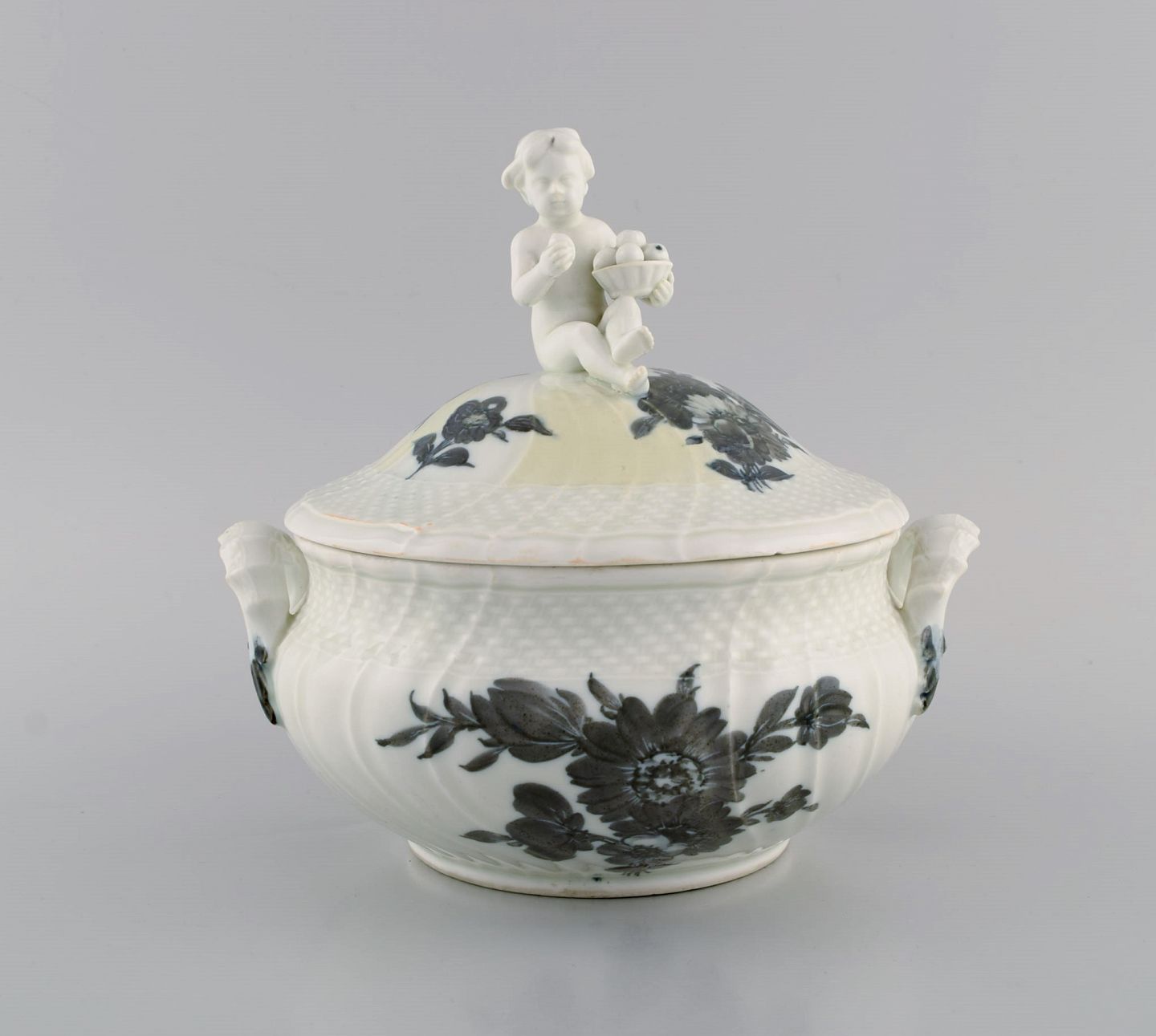 Tidlig Royal Copenhagen Blå Blomst Svejfet lågterrin i porcelæn med håndmalede blomster. Låg modelleret med frugtspisende putti. Ca. 1820.