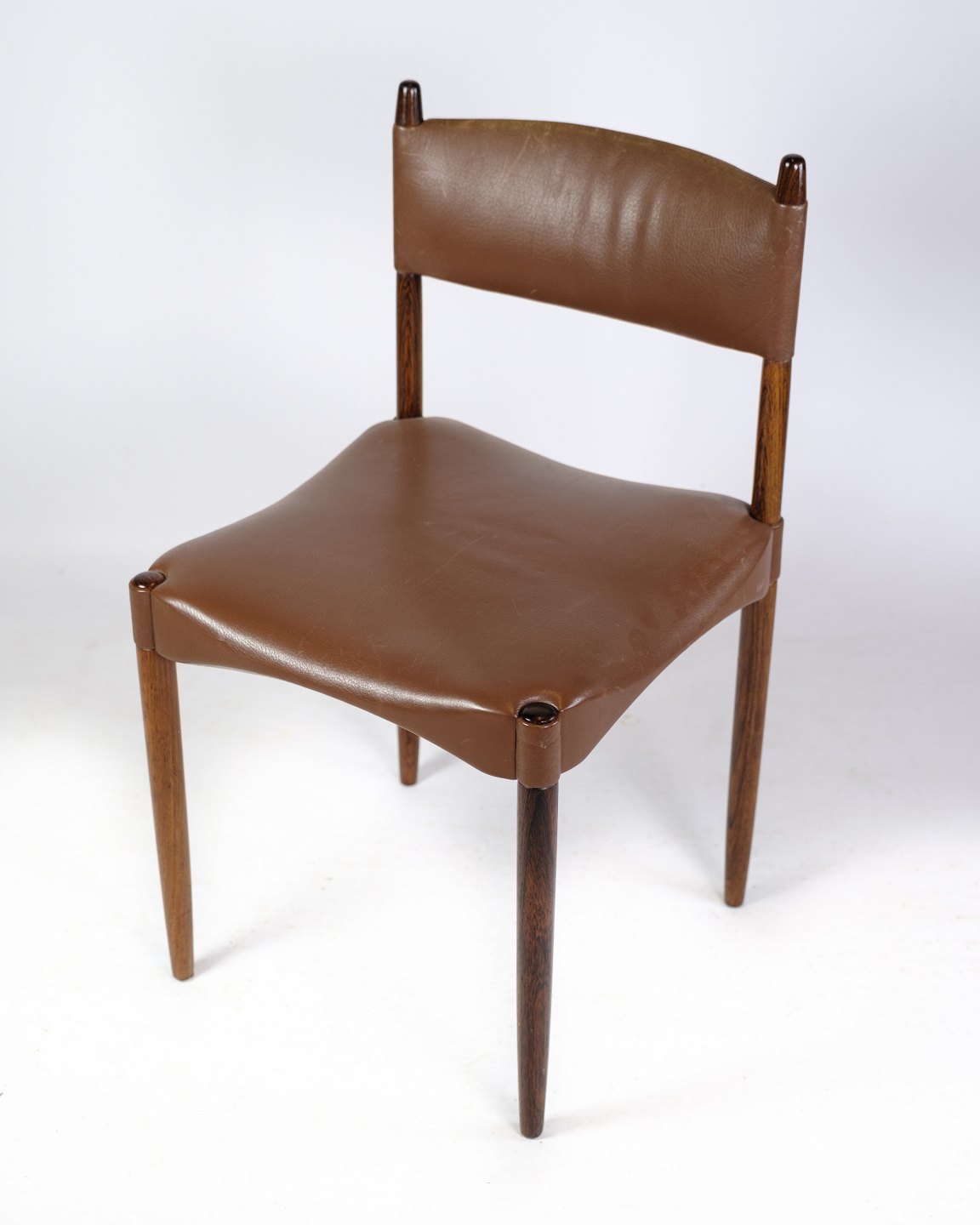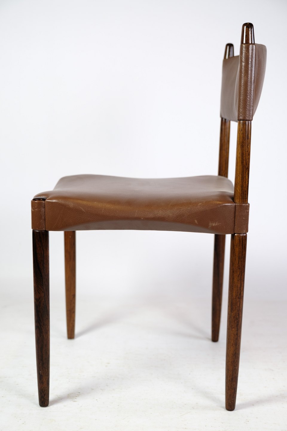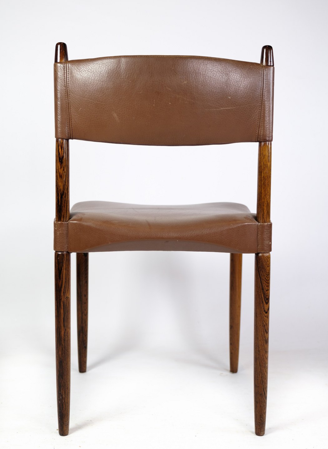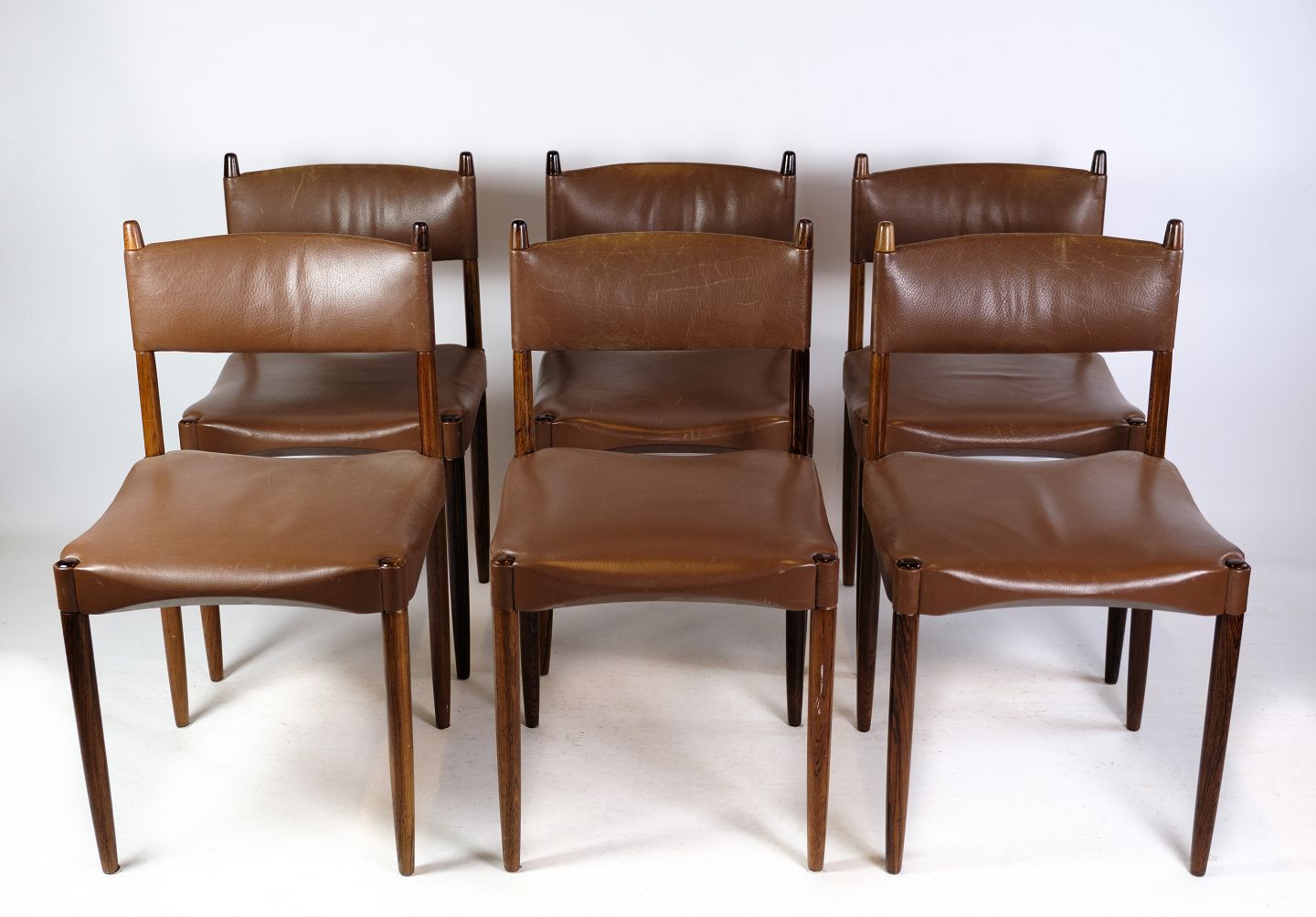 A set of 6 chairs of Danish design made of solid rosewood with brown leather from around the 1960s. The wood on the chairs is in very fine used condition and the leather has a nice patina.