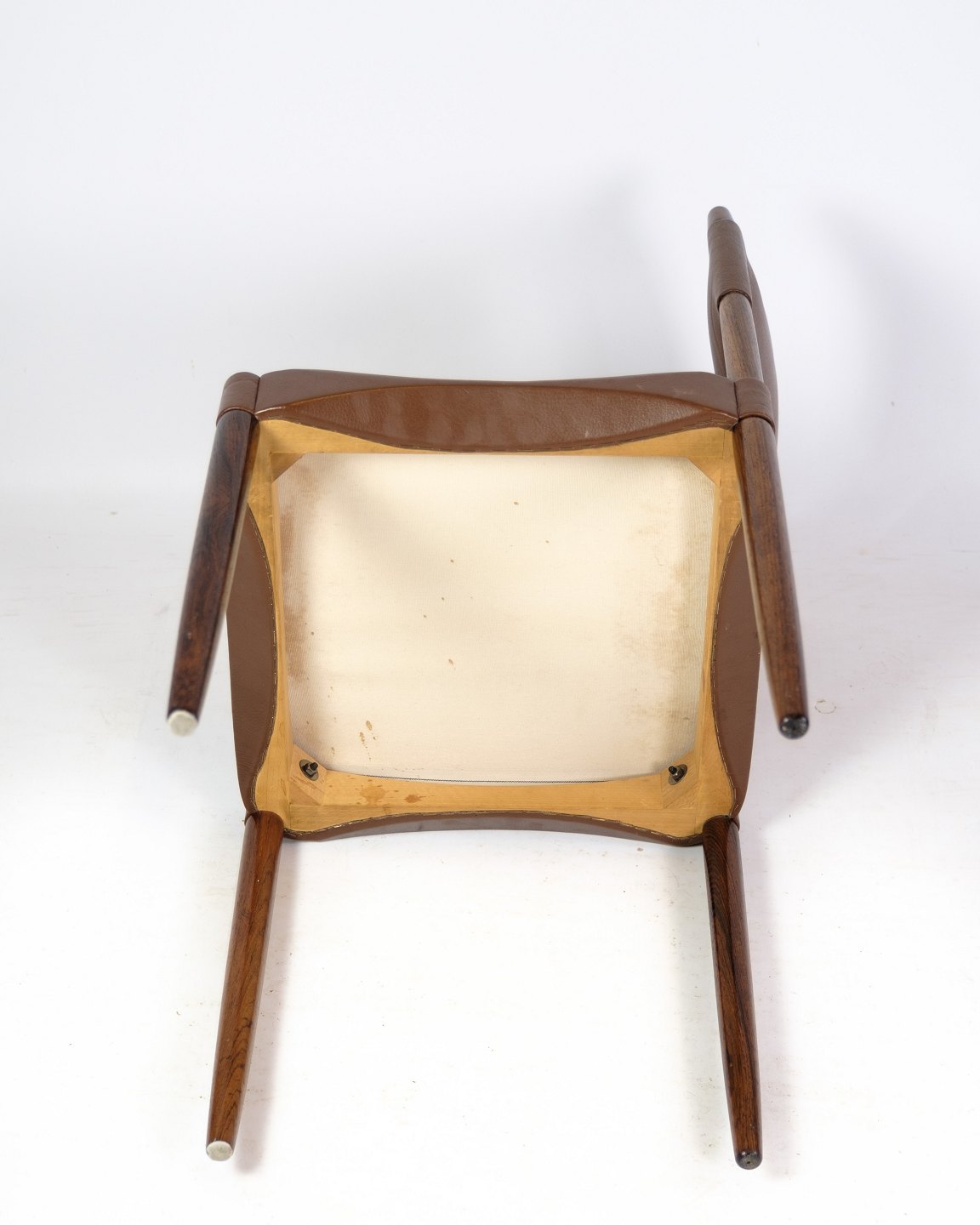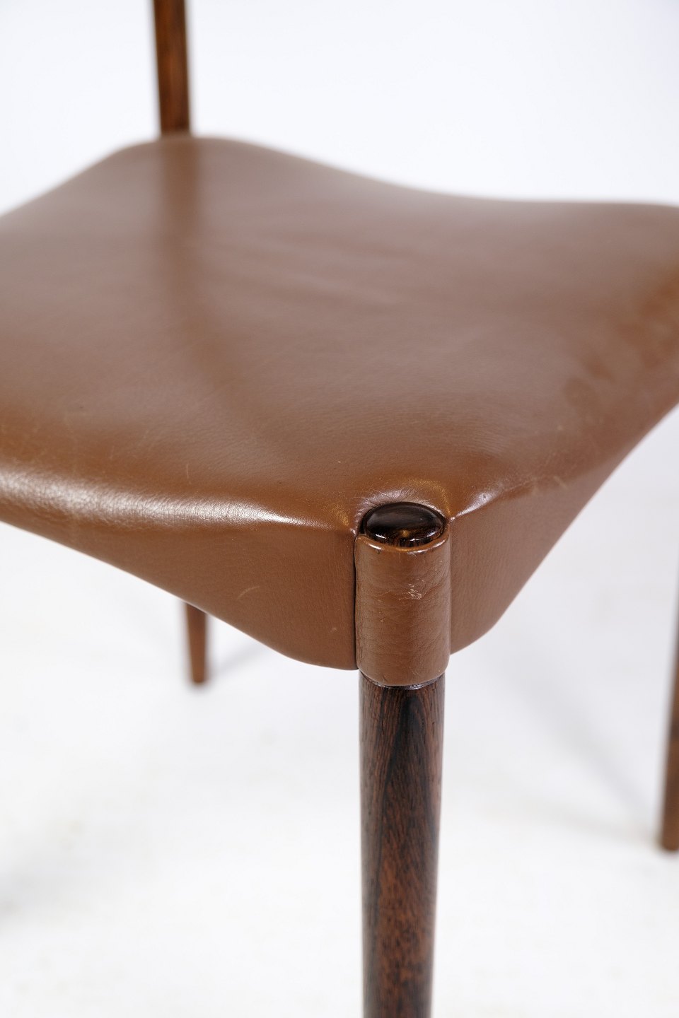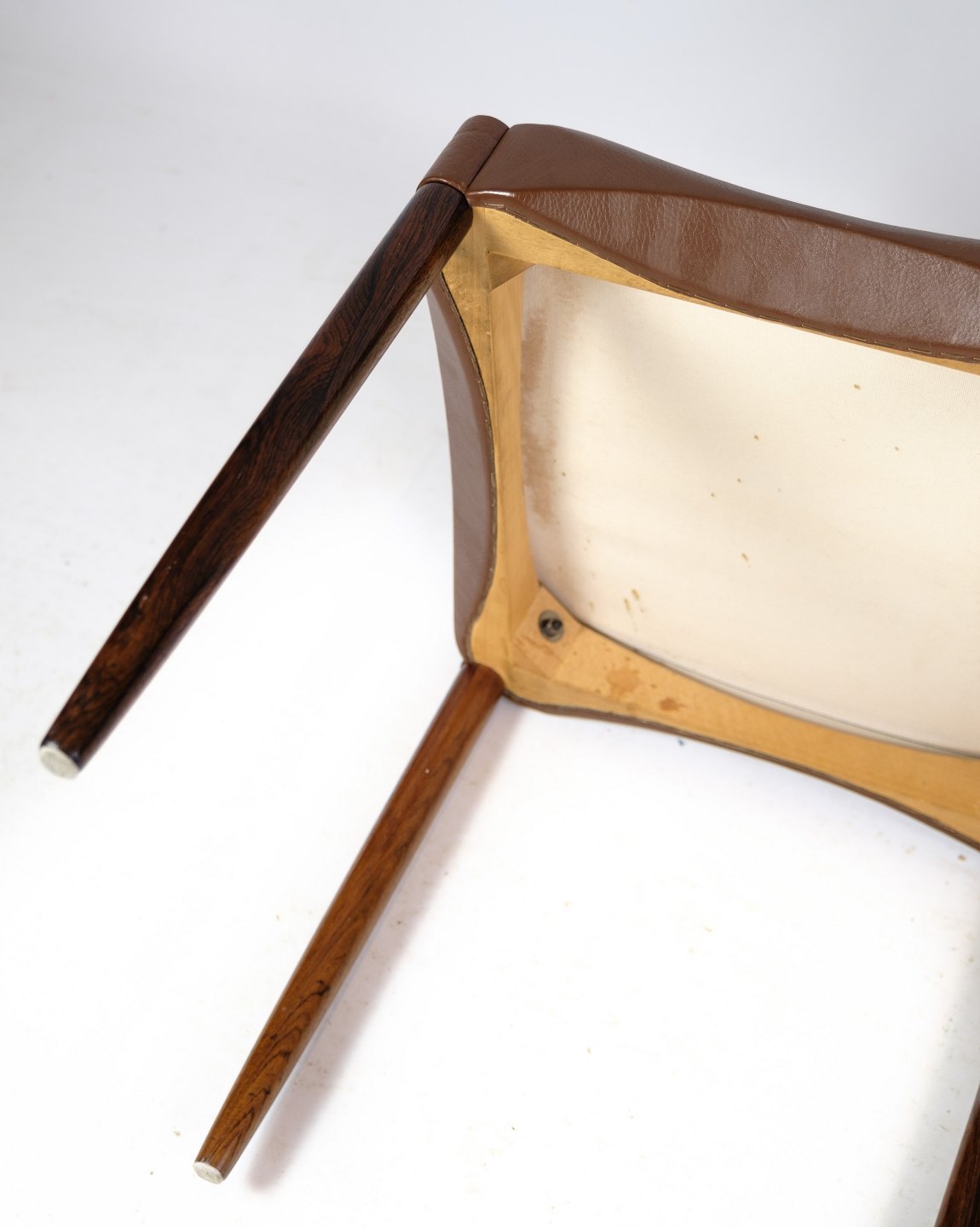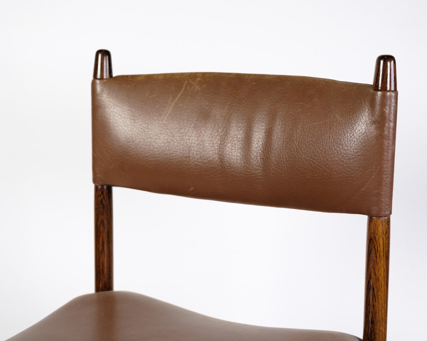 A set of 6 chairs of Danish design made of solid rosewood with brown leather from around the 1960s. The wood on the chairs is in very fine used condition and the leather has a nice patina.