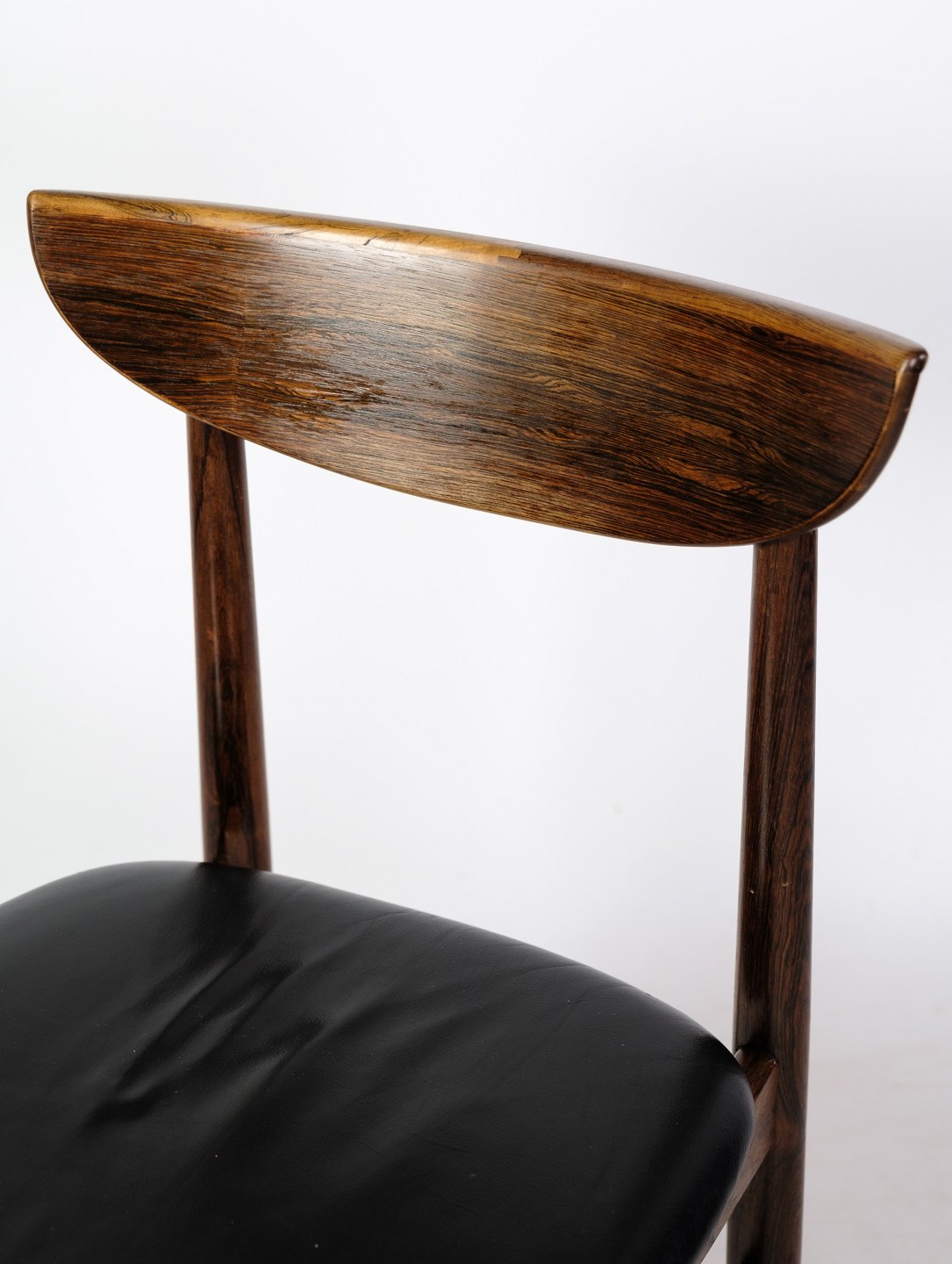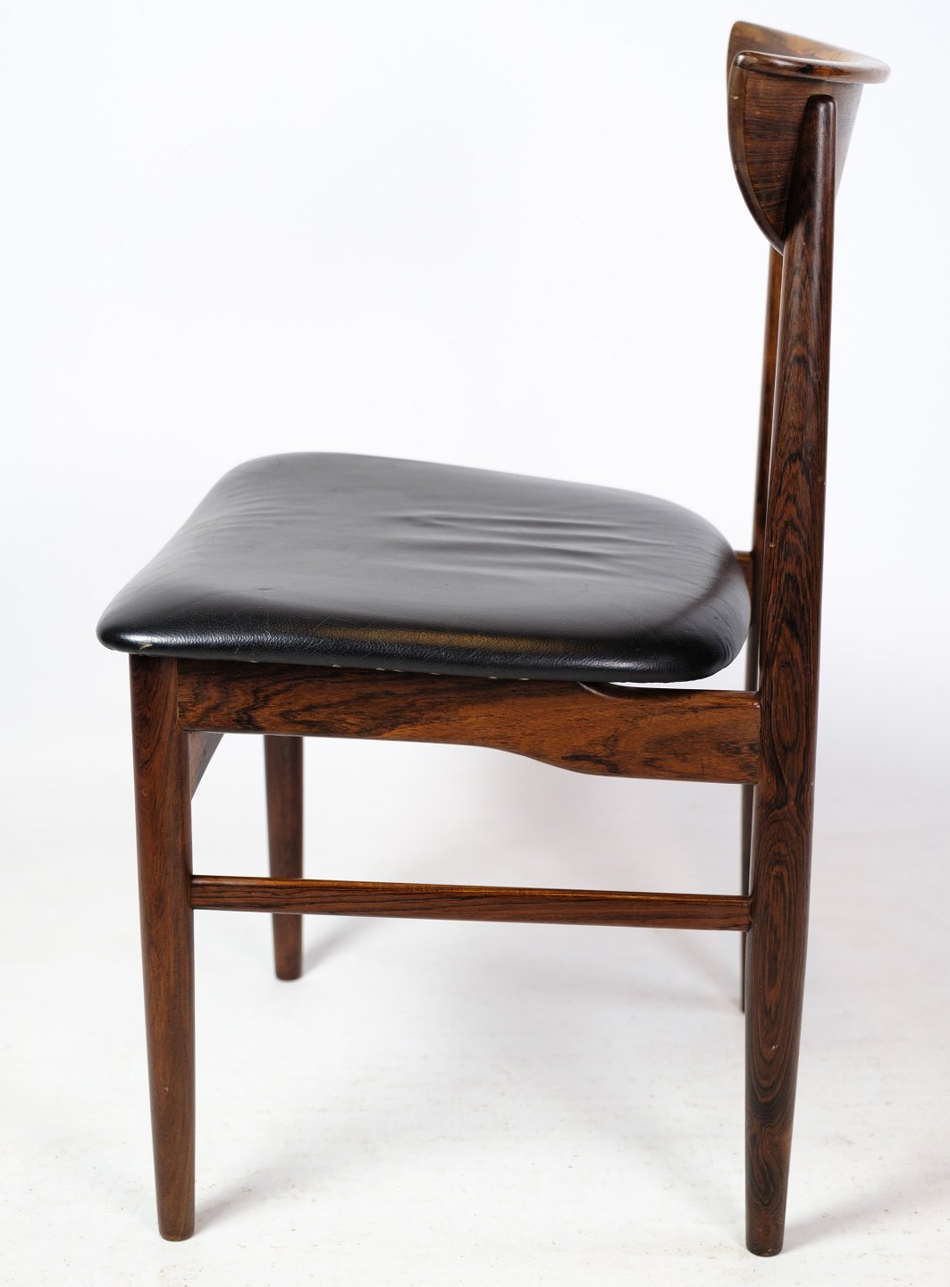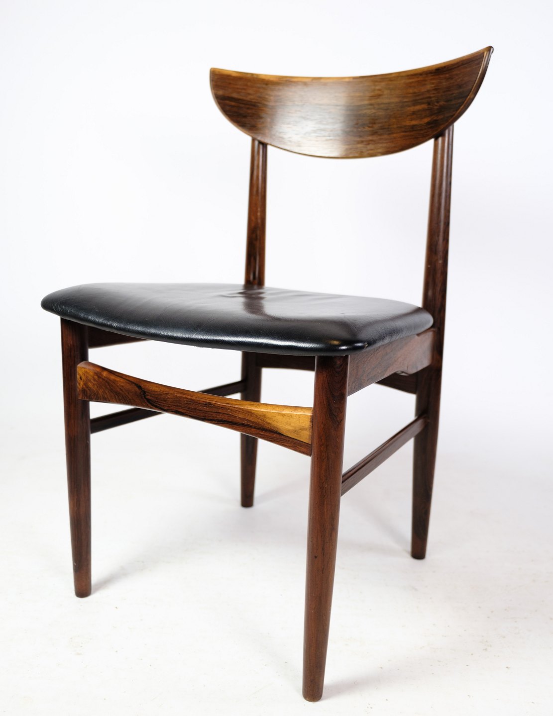 A set of six dining table chairs of Danish design in rosewood with black leather from around the 1960s.