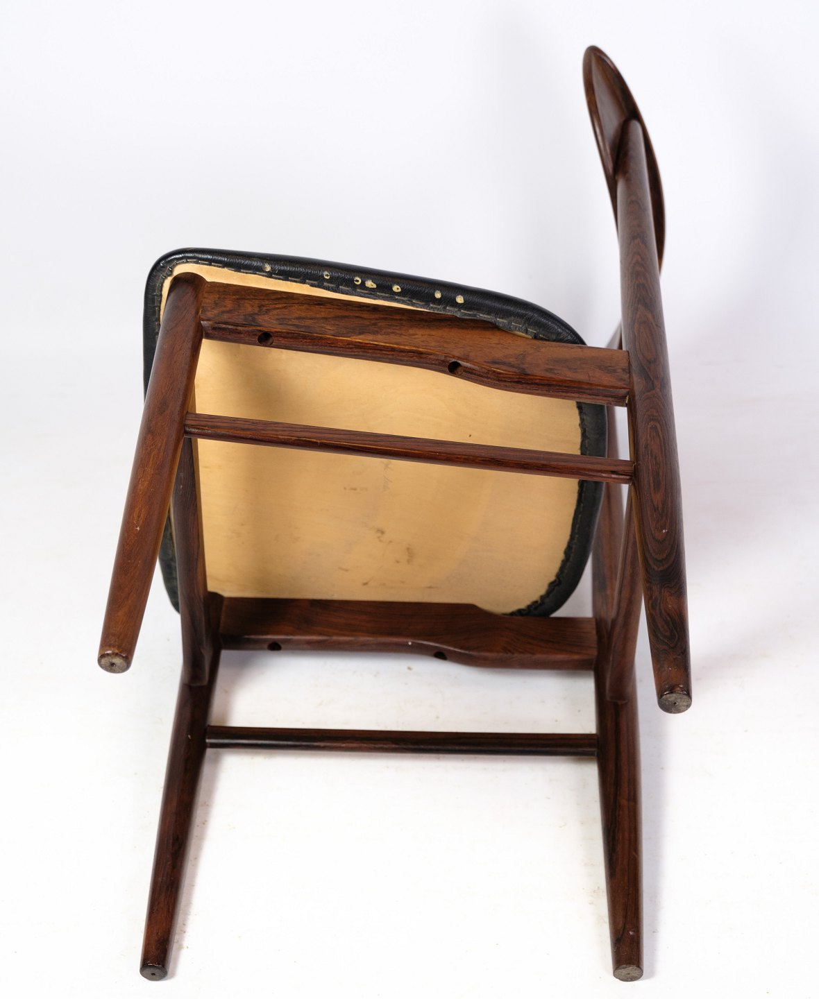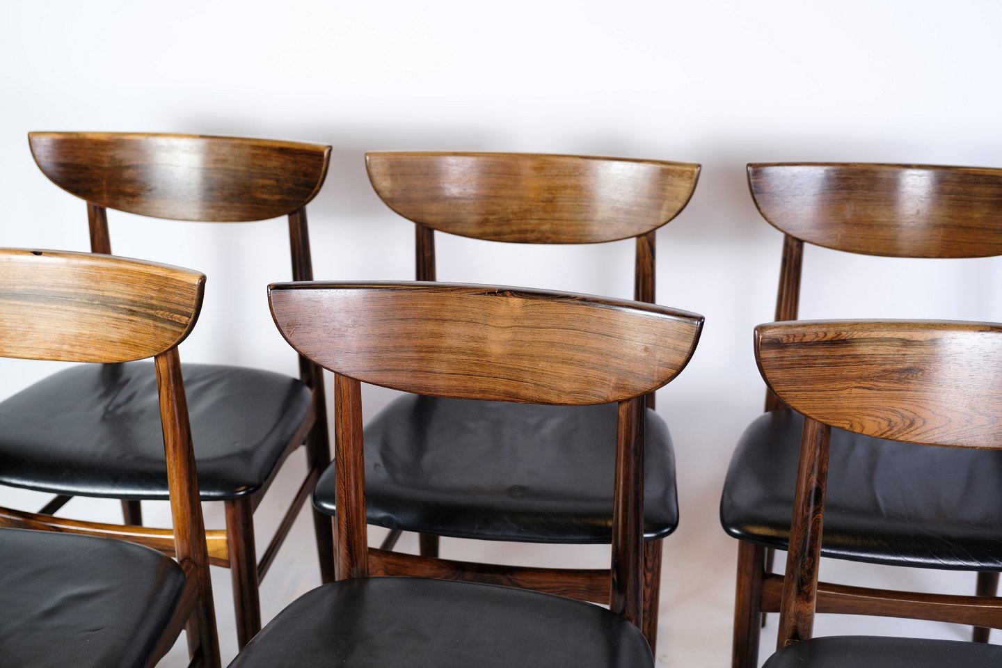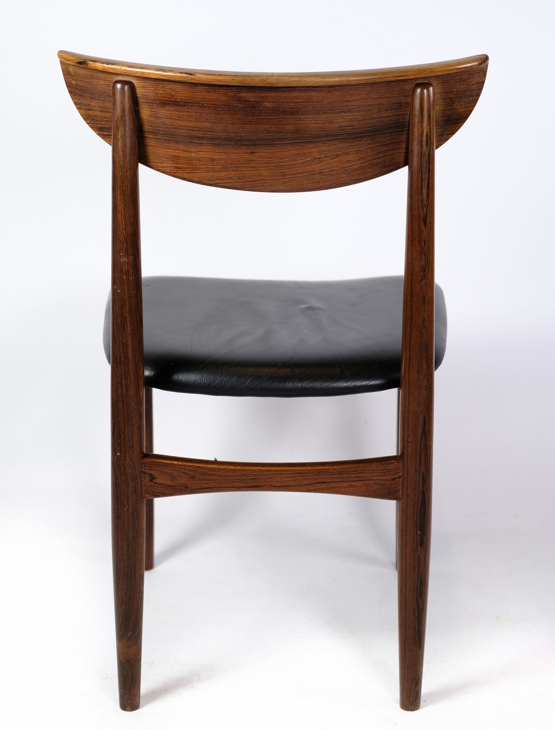 A set of six dining table chairs of Danish design in rosewood with black leather from around the 1960s.