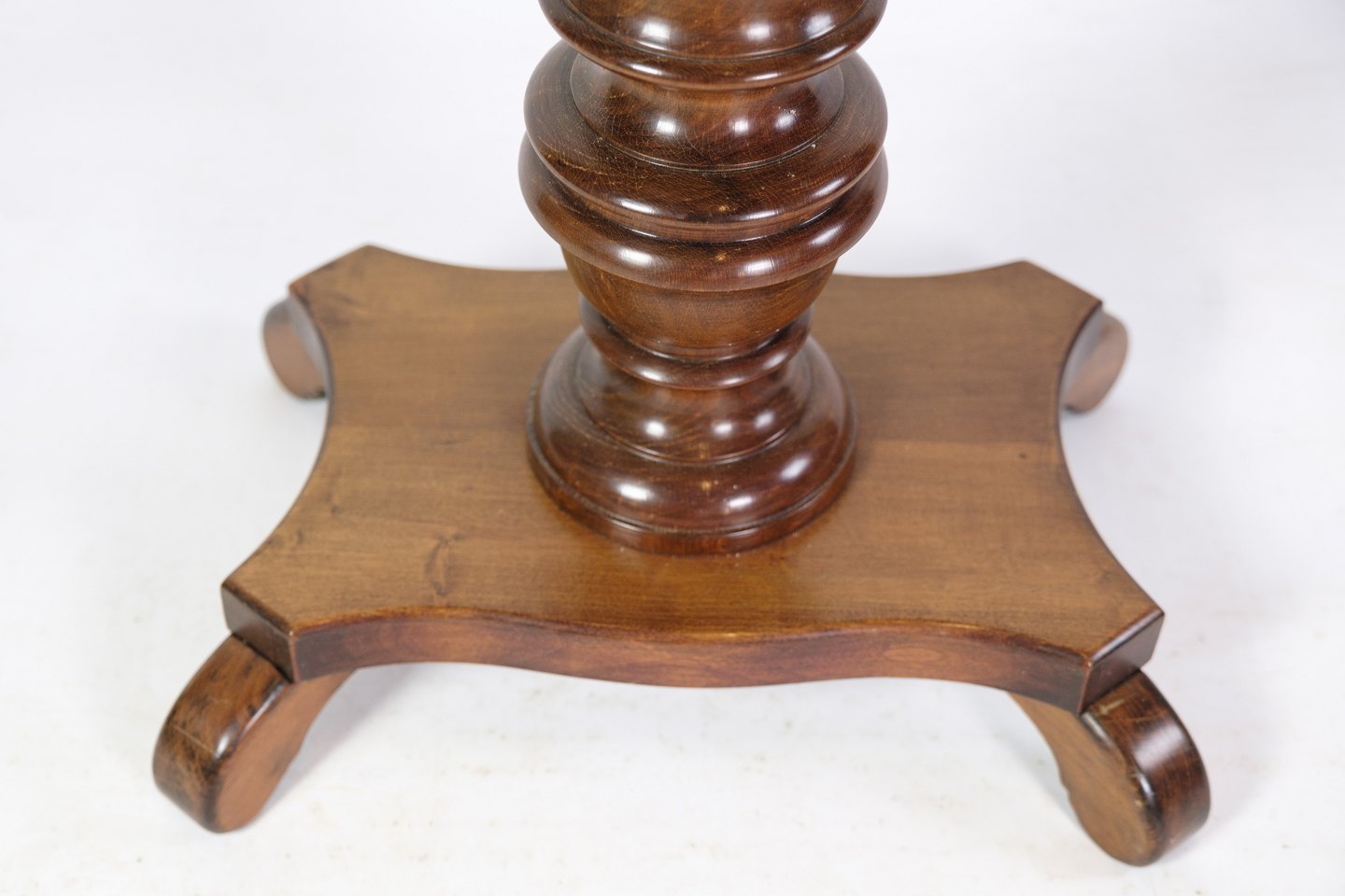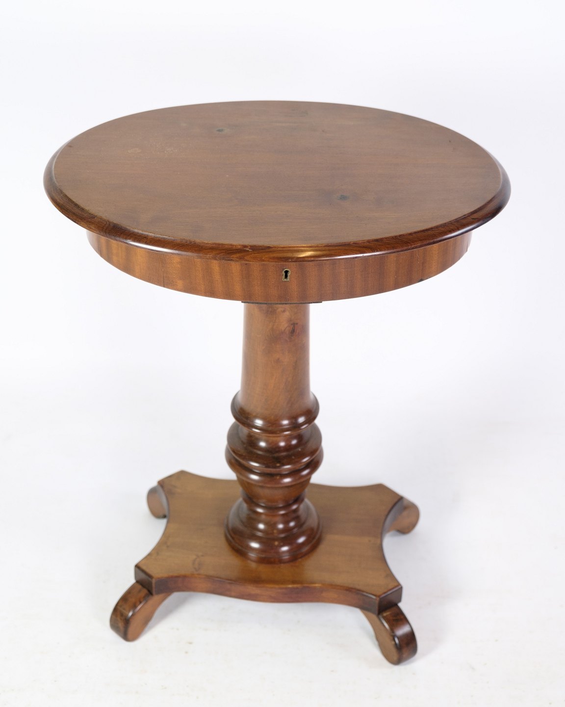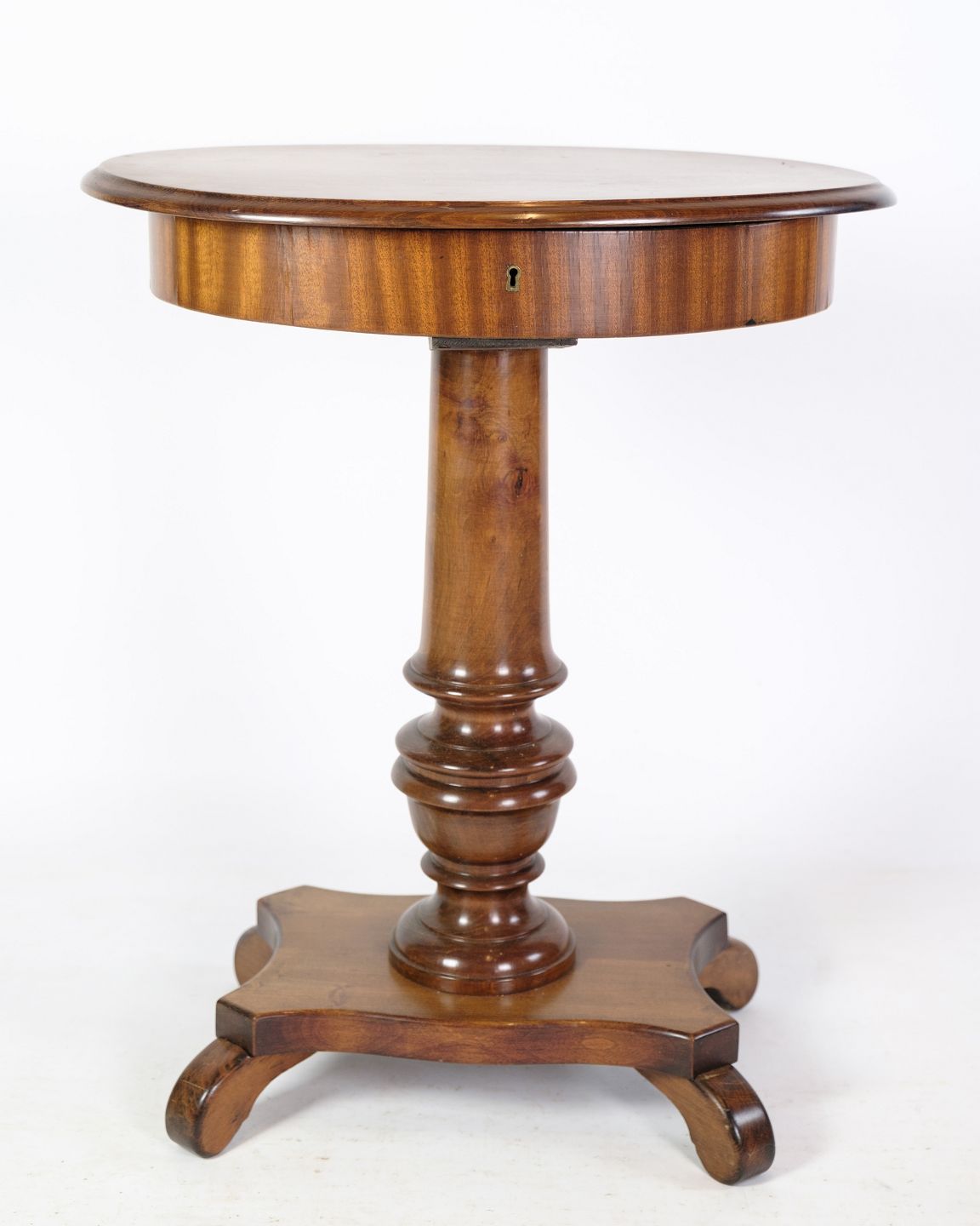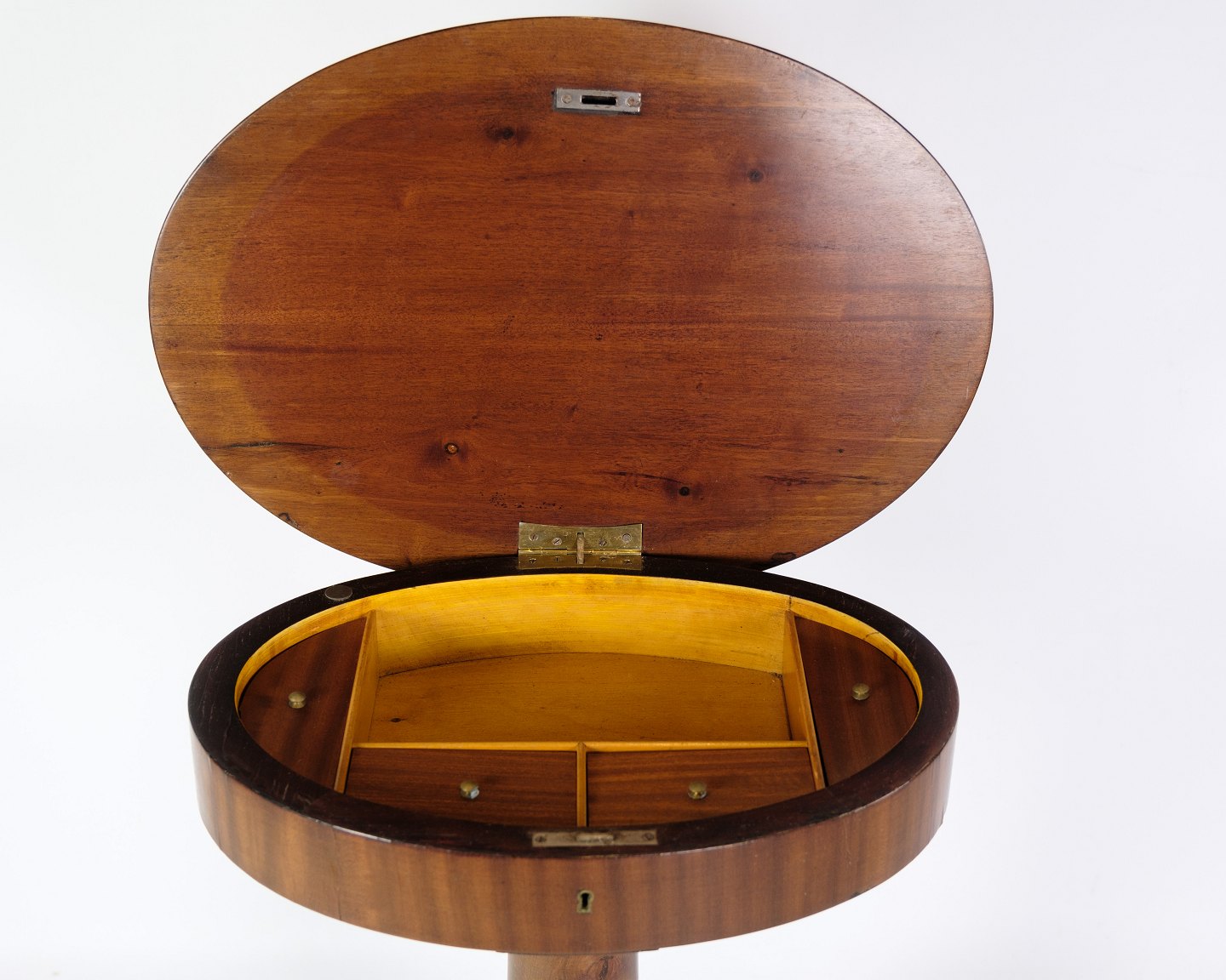 Oval sewing table / lamp table on pillar with mahogany sewing room from around the 1890s.
