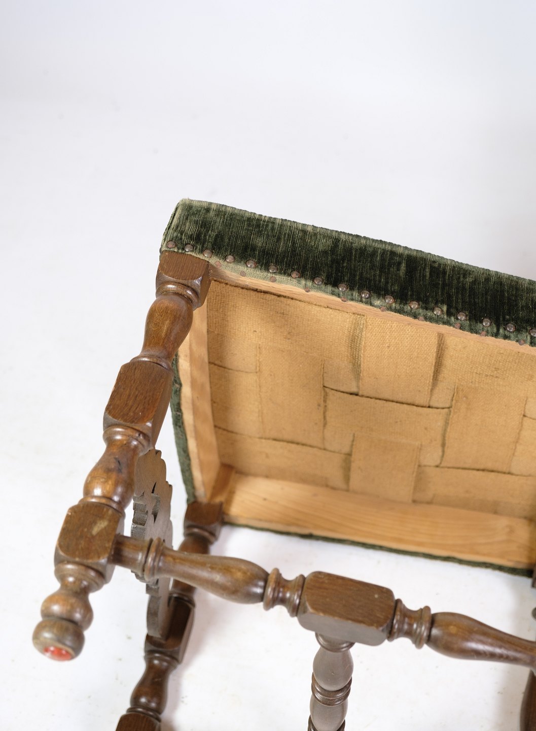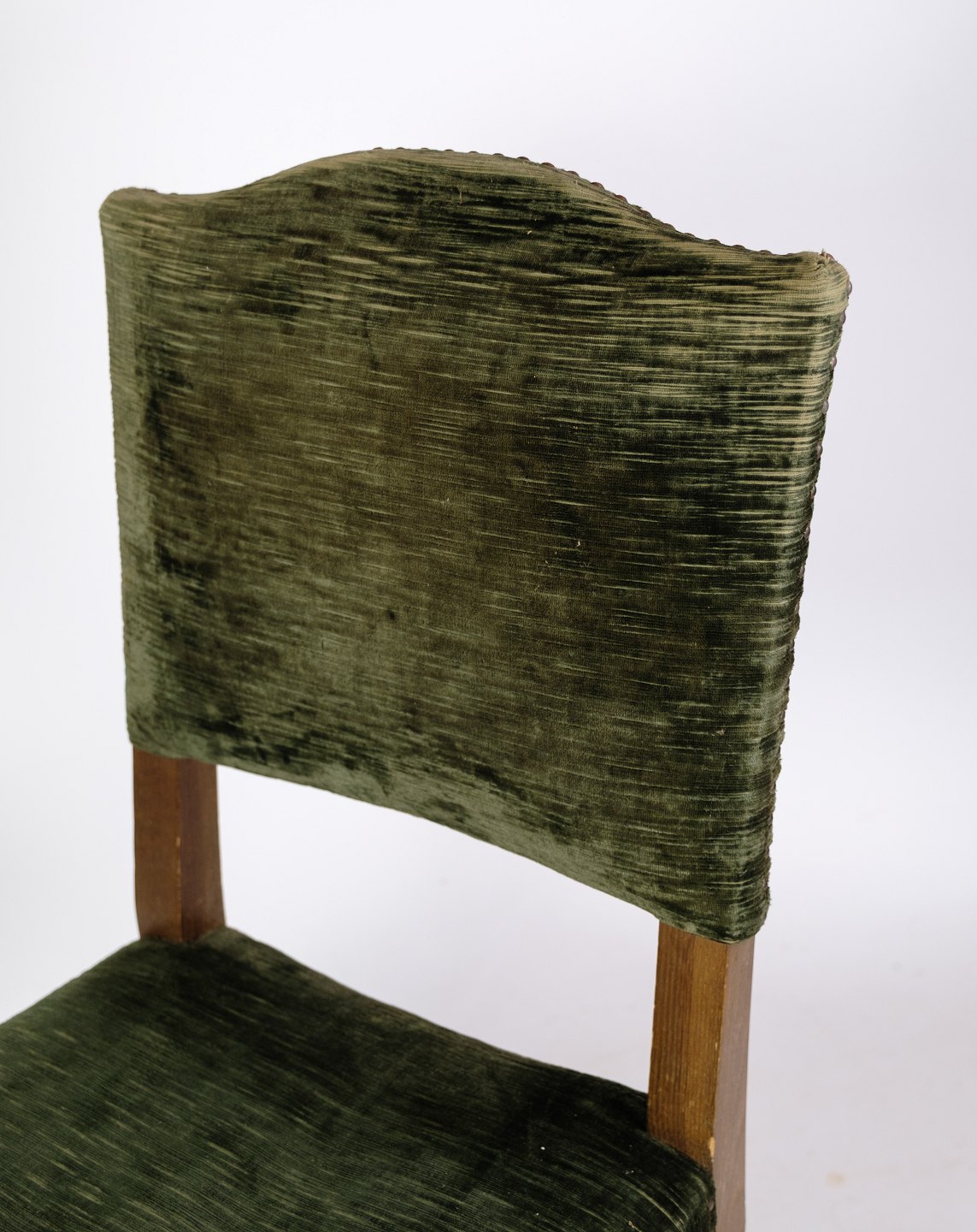 2 stole i egetræ i Renæssancen stil polstret med grøn velour stof fra omkring år 1930'erne