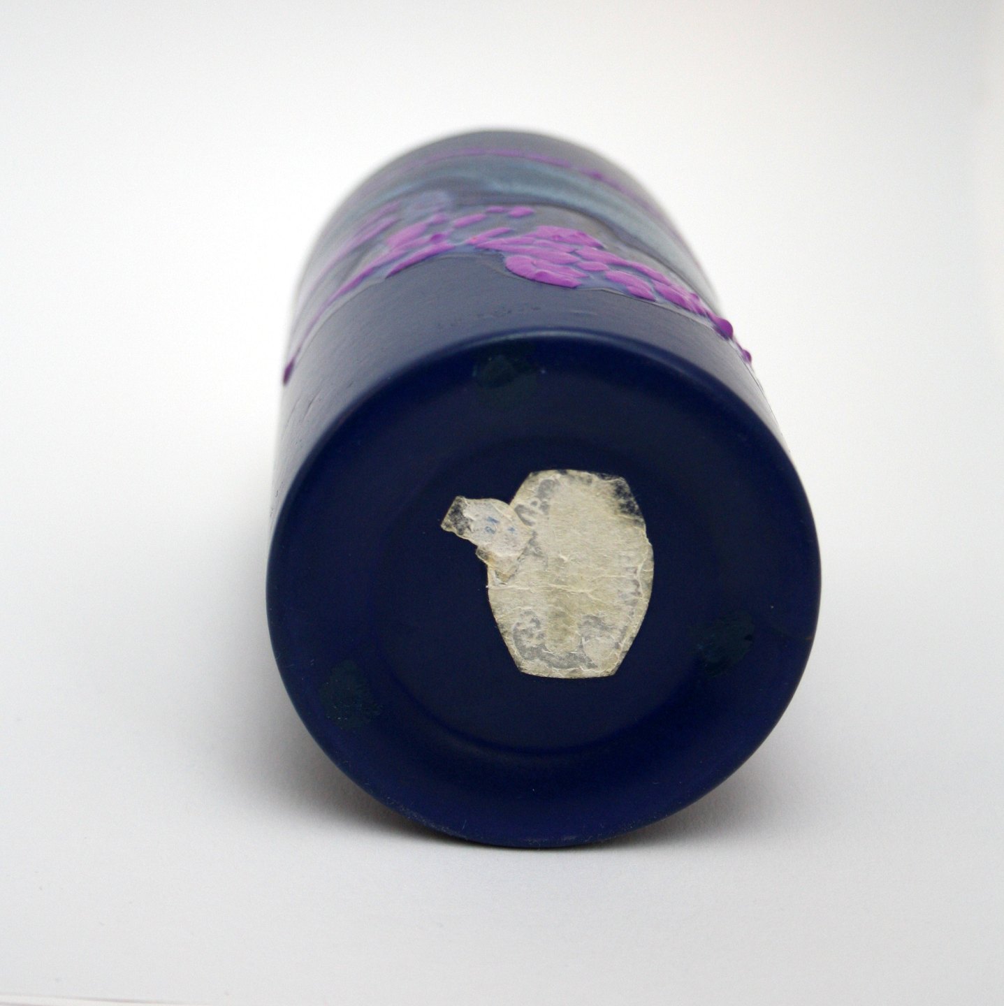 Knabstrup, Marina-serien, Cylinder vase i koboltblå glasur som bundfarve, med dekoration i lilla, lyseblå og pink. Designet af Richard Manz i starten af 1970'erne. Højde 14 cm. Diameter 7,8 cm. Fin stand. Pris: 225 kr.