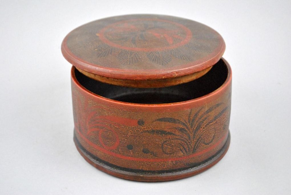 Russisk dåse af bemalet træ med låg. Ø: 18, H: 10 cm.