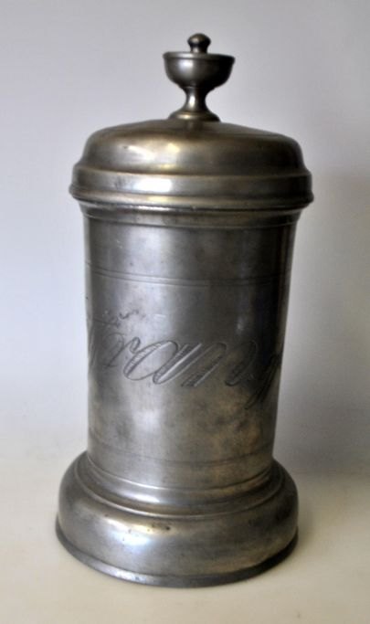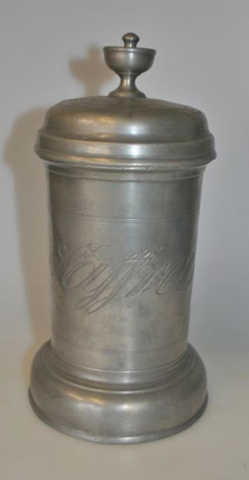 Tysk apoteker krukke i tin, empire ca. 1800. På siden anført: Saffran gft. Stemplet indeni. Højde: 24 cm.