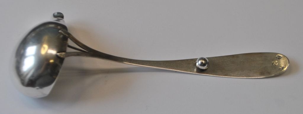 Empire sovse ske af sølv, 1824, Danmark. Mester Nicolay Hansen (1775 - 1835) Tønder. Stemplet. Verso indgravering: Hans Gechenck 1824. L.: 18 cm.
