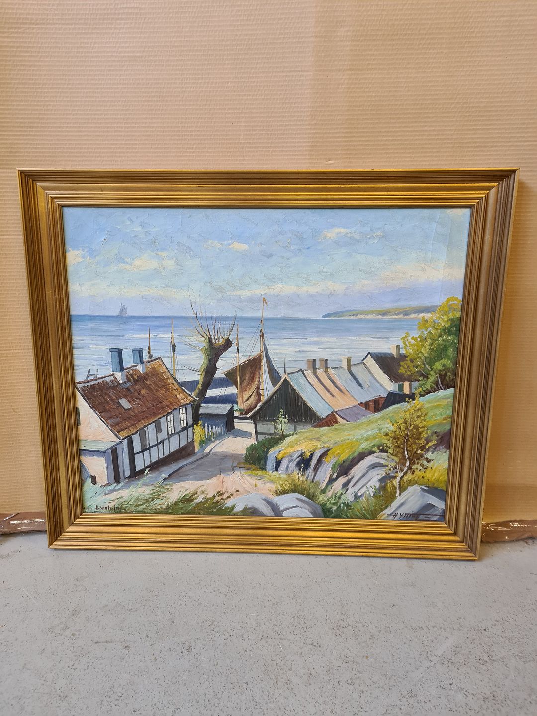 Bornholmer malerei i guld malet ramme fra 1950erne.