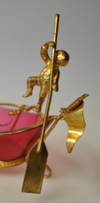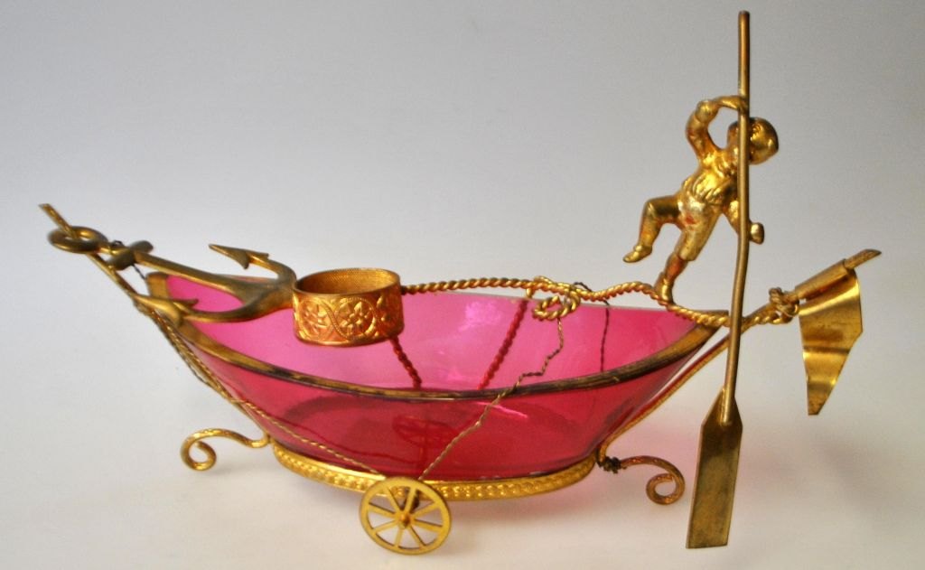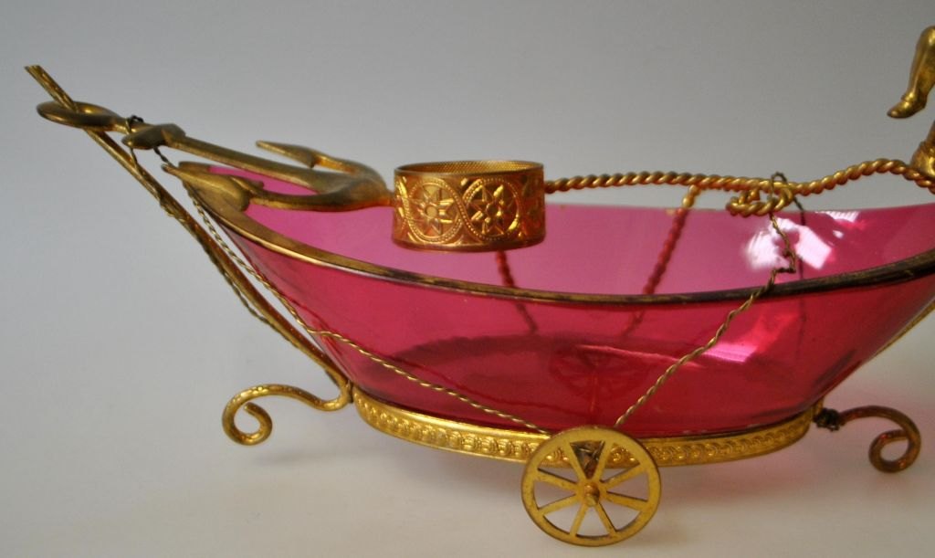 Bøhmisk glasbåd, som venetiansk gondol, ca.1900. Hindbærfarvet glas med forgyldt messingmontering med figur. L.: 25 cm.