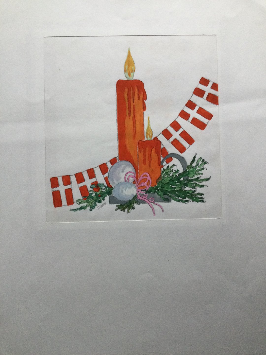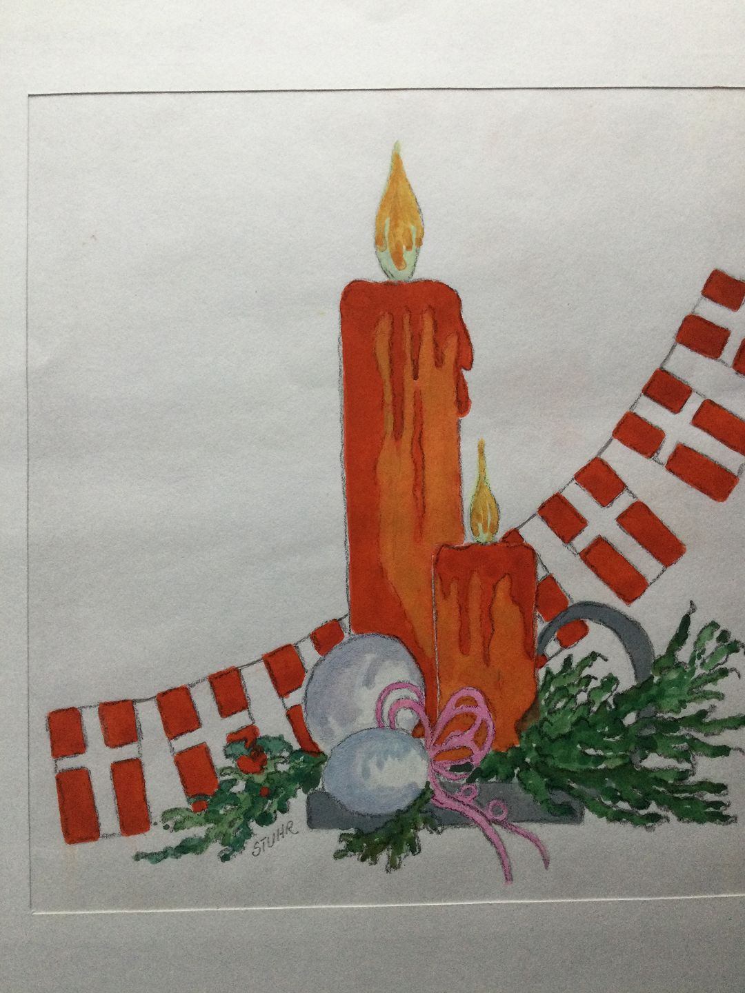 Akvarel af Erik Stuhr - Juledekoration og Danenbrogs guirlande.