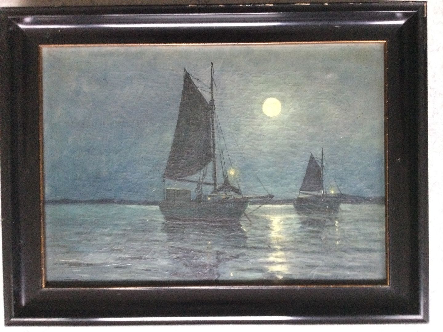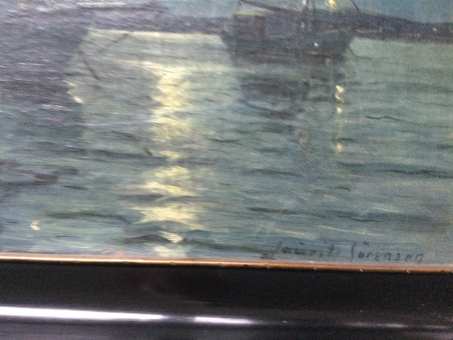 Maleri af Lauritz Sørensen - Sejlskibe på fjorden i måneskin.