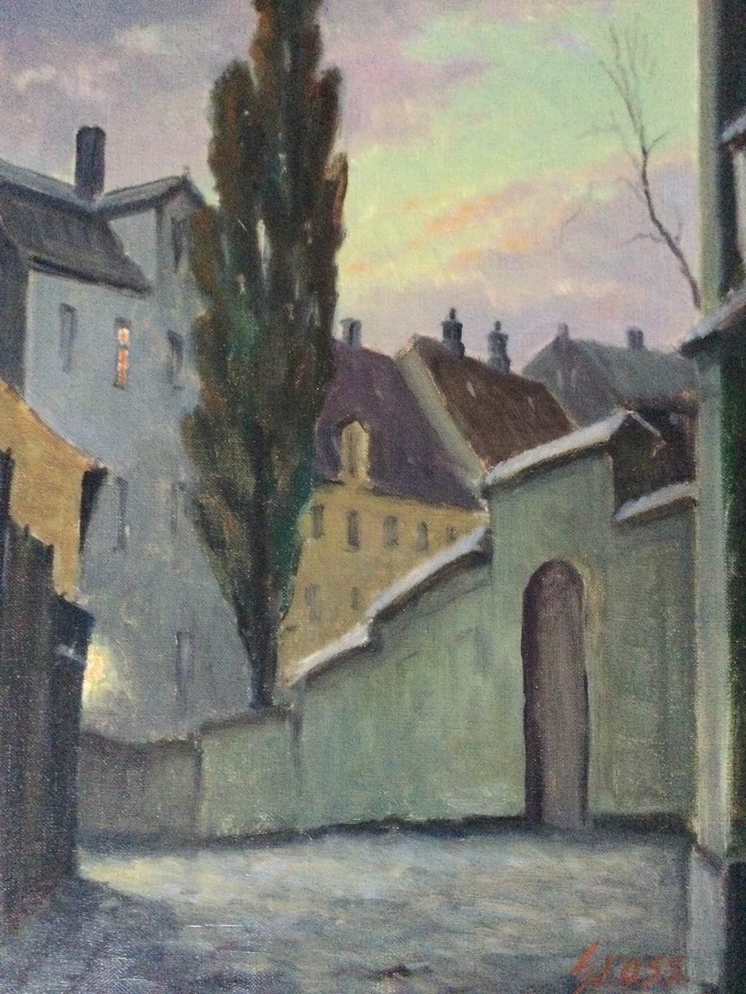 Text available in Danish: Maleri af Einar Gross - Parti fra Latinergyden, Aalborg.