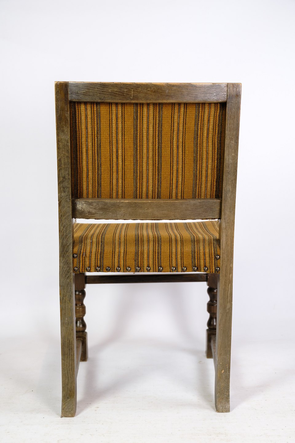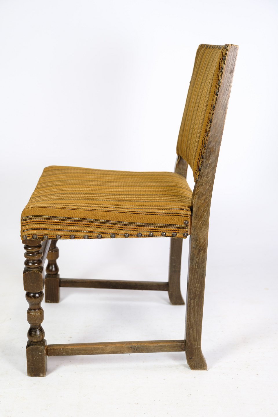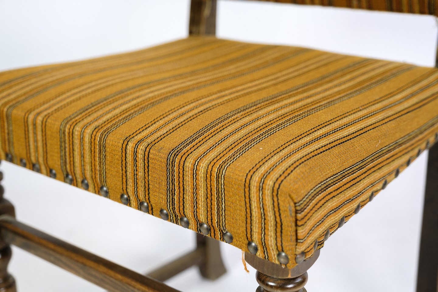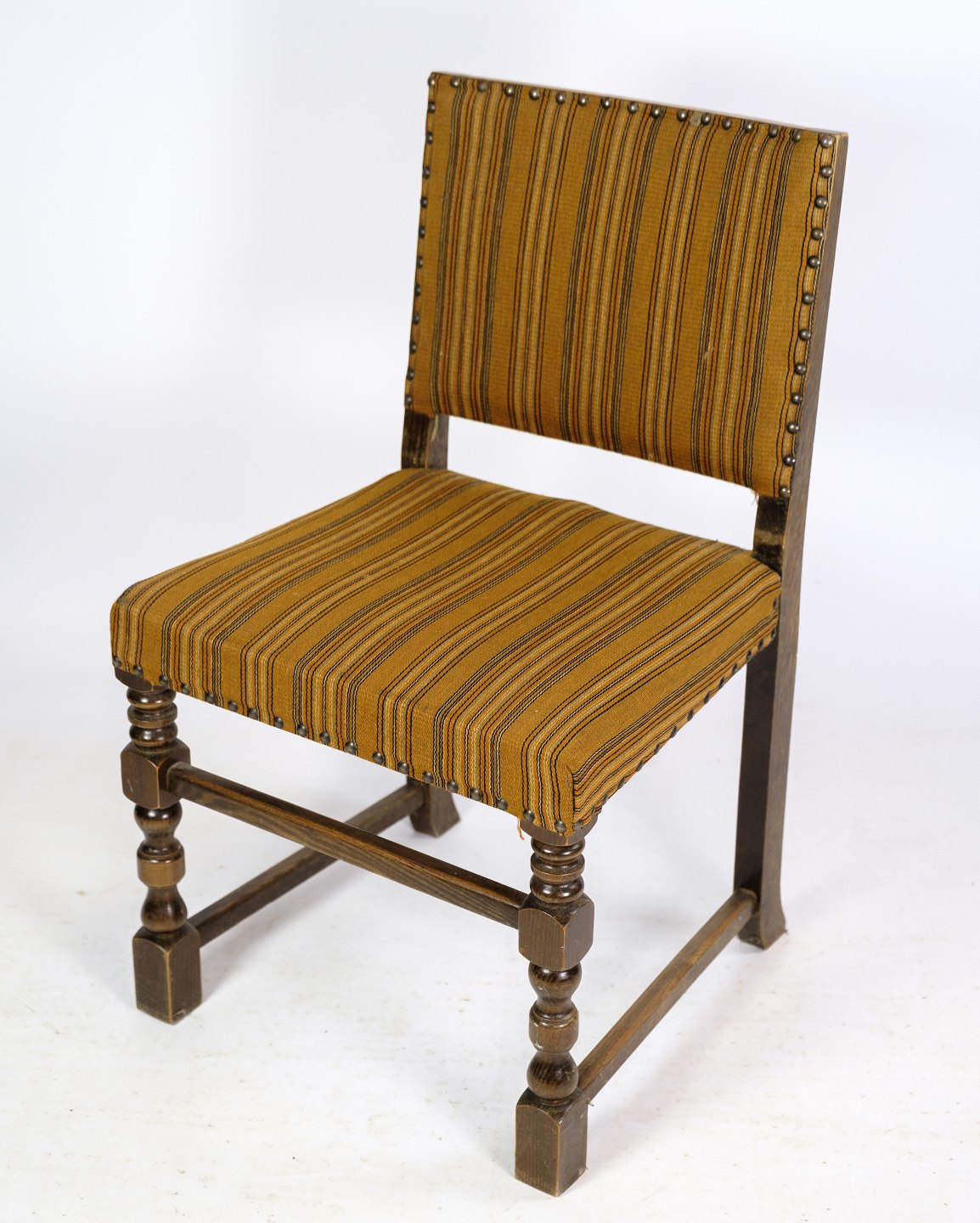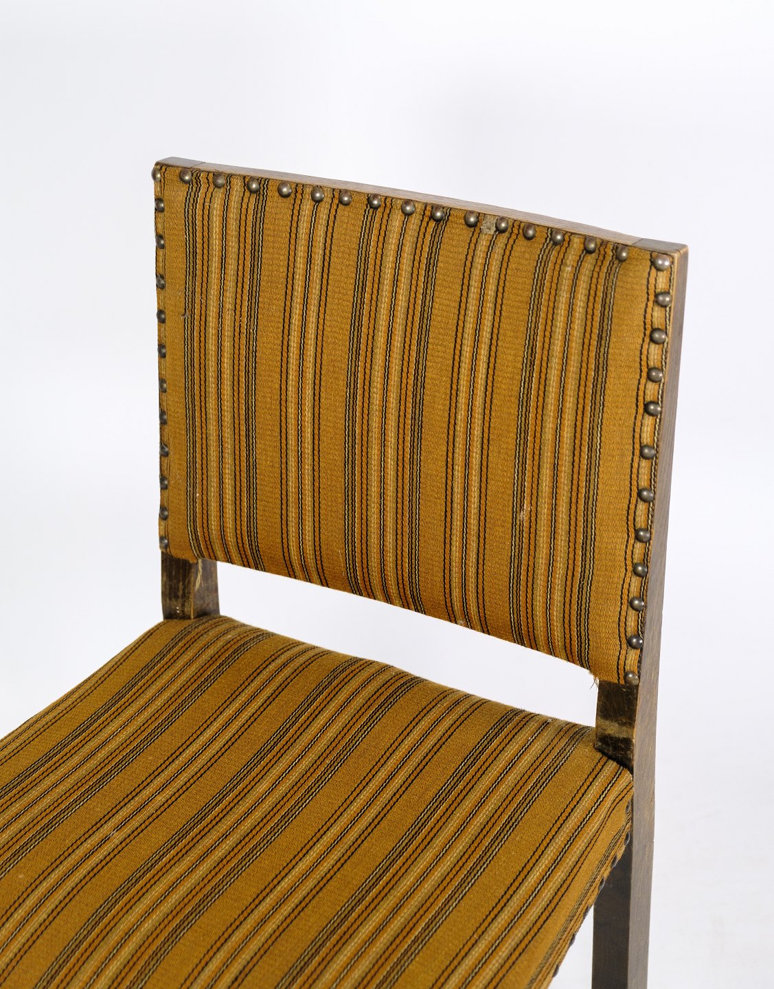 Sæt af 4 spisebordsstole i egetræ med stribet stof fra omkring år 1930’erne