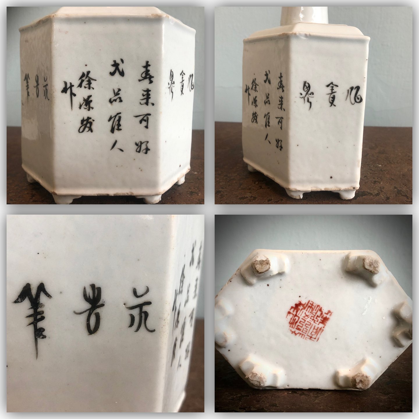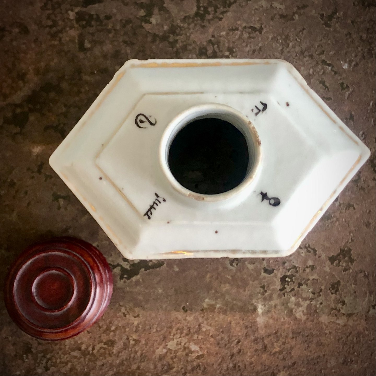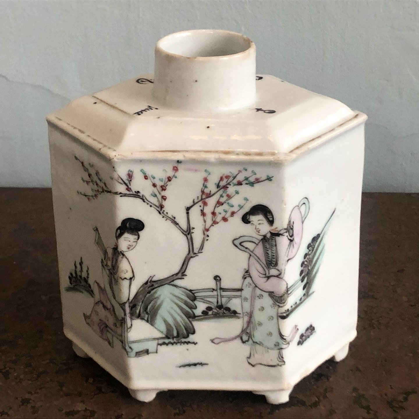 Kinesisk tedåse af porcelæn. Sekskantet korpus dekoreret med blomster, fuglemotiver i emaljefarver samt Kinesiske skrifttegn. Låg af træ. Rødt stemplet i bunden.