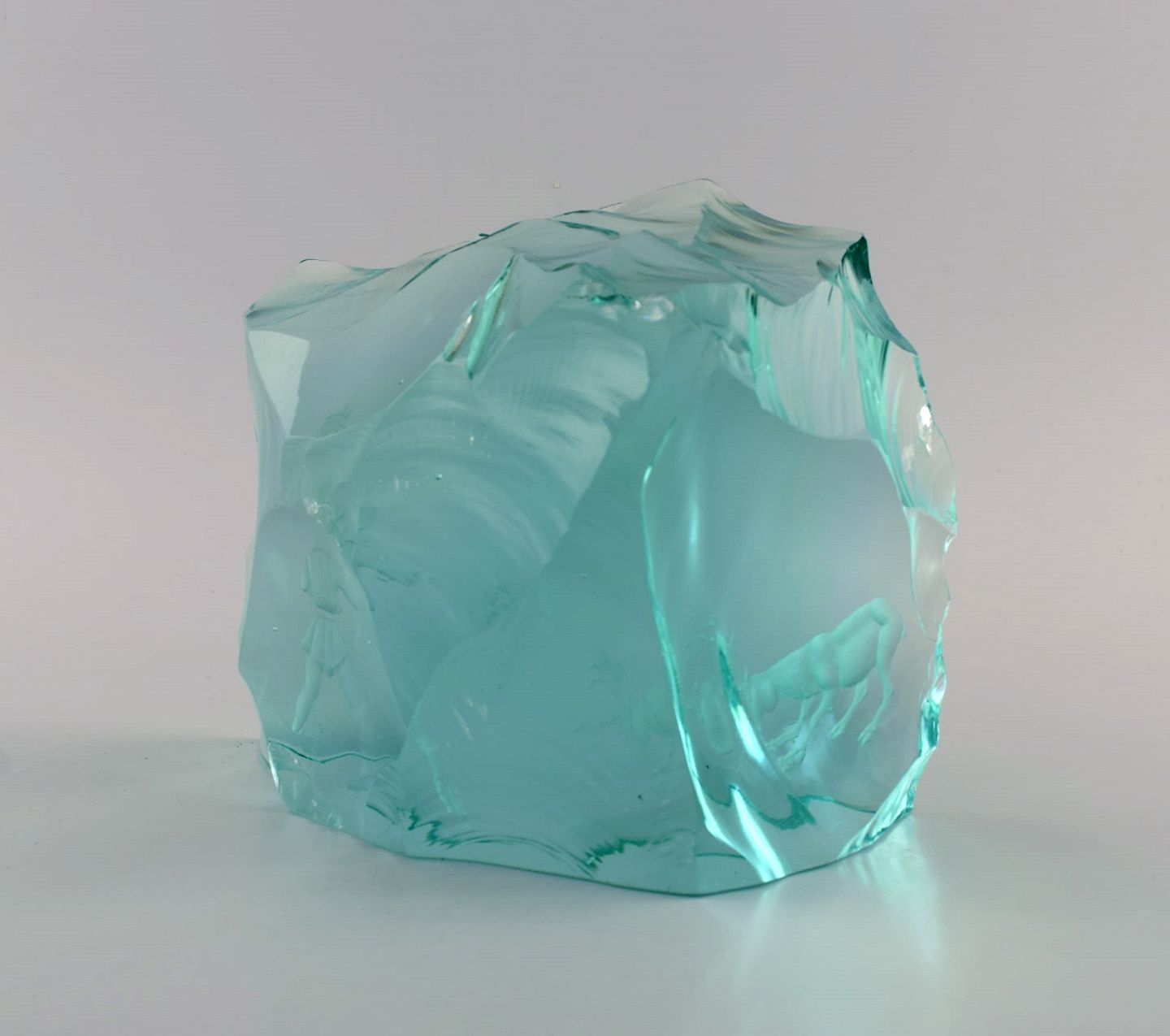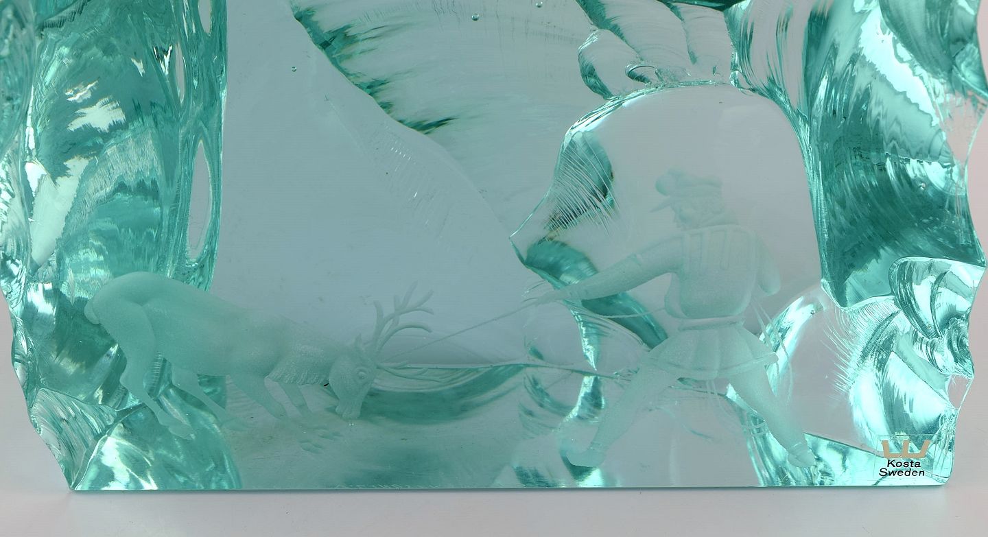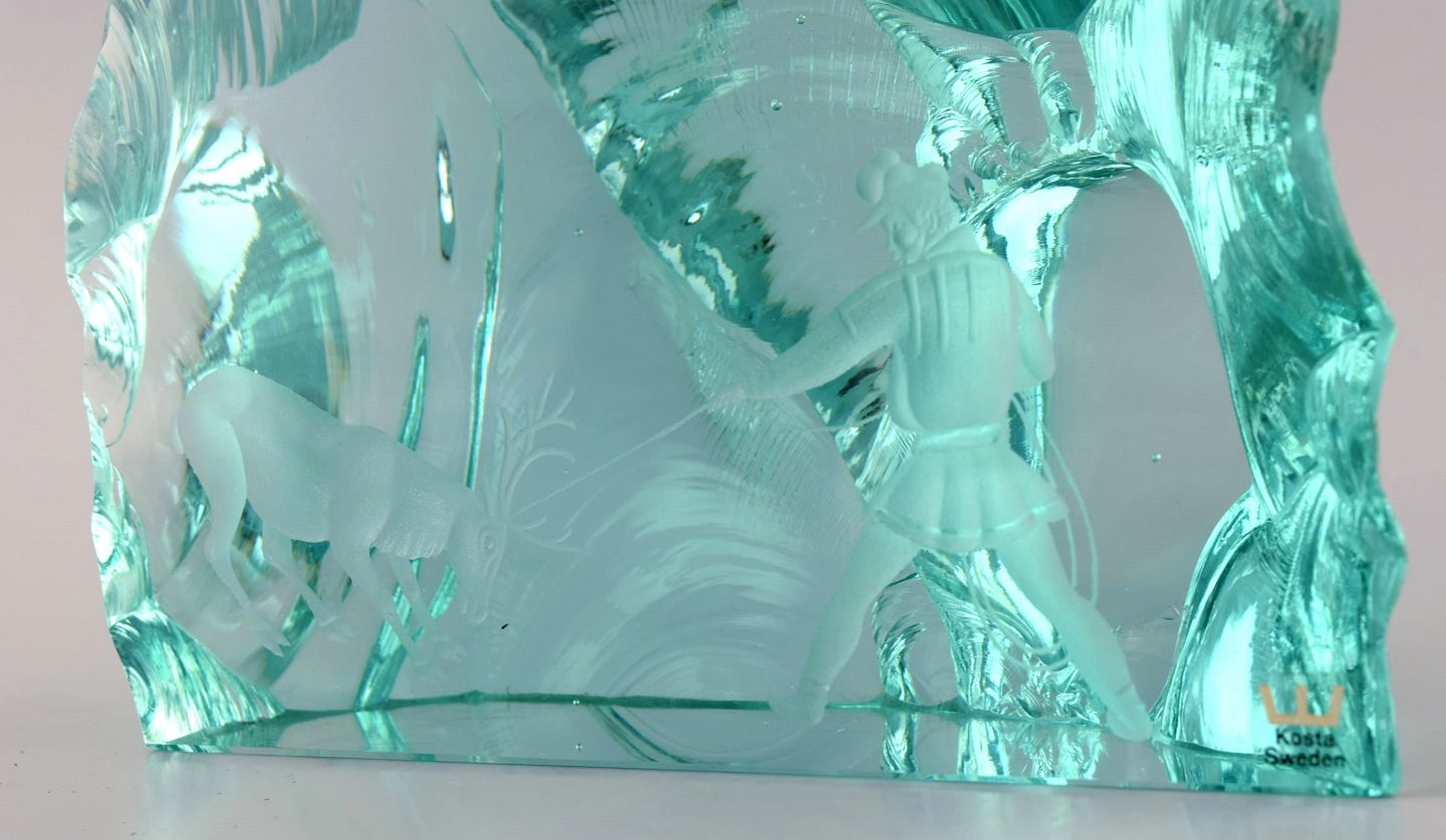 Vicke Lindstrand (1904-1983) for Kosta Boda. Unika glasblok i blågrønt mundblæst kunstglas. Dekoreret med samer der jager rensdyr. 1960'erne.