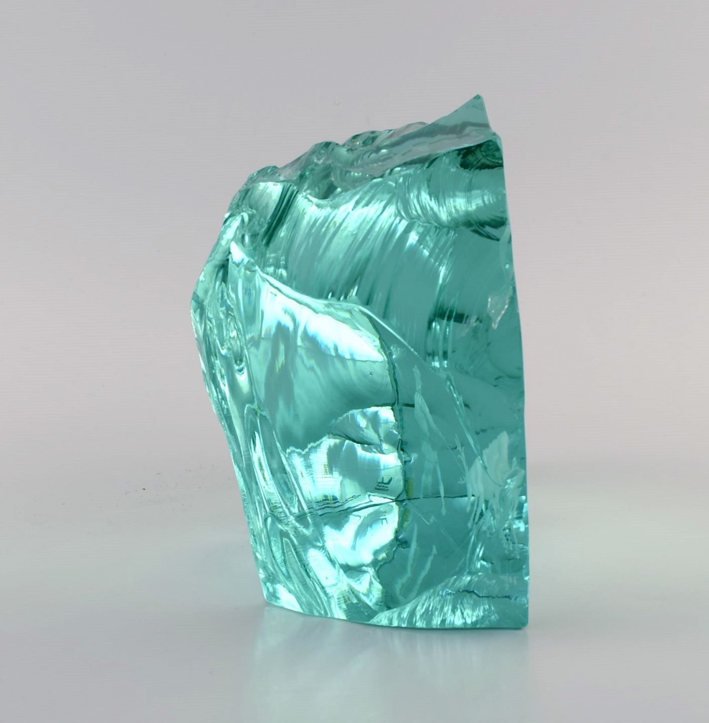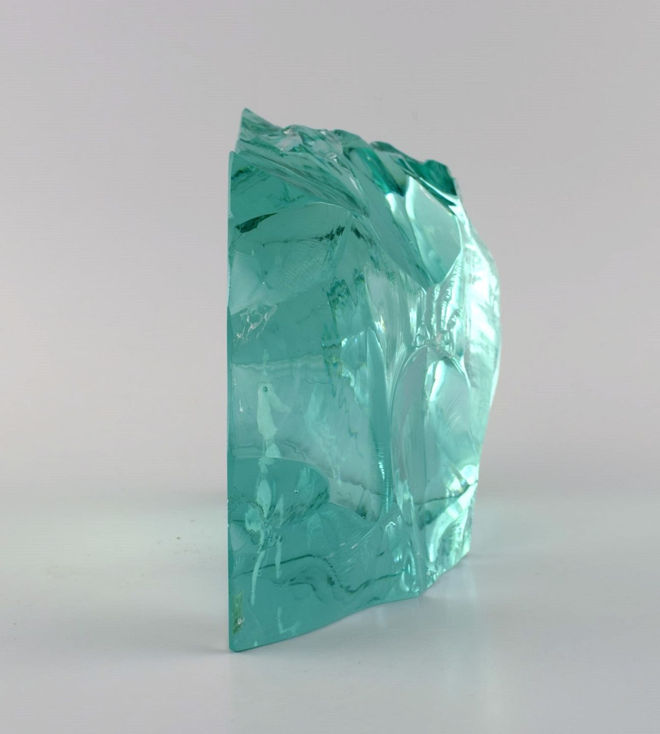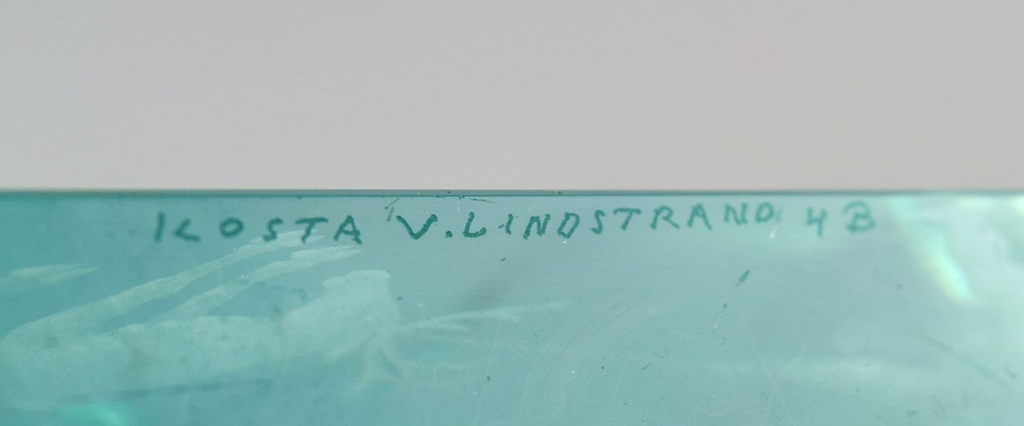 Vicke Lindstrand (1904-1983) for Kosta Boda. Unika glasblok i blågrønt mundblæst kunstglas. Dekoreret med samer der jager rensdyr. 1960'erne.