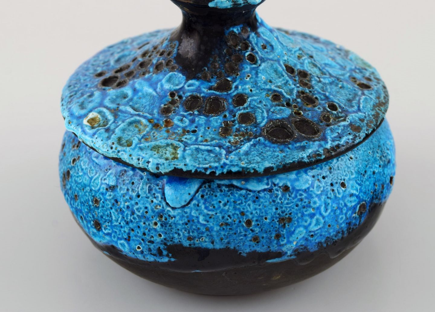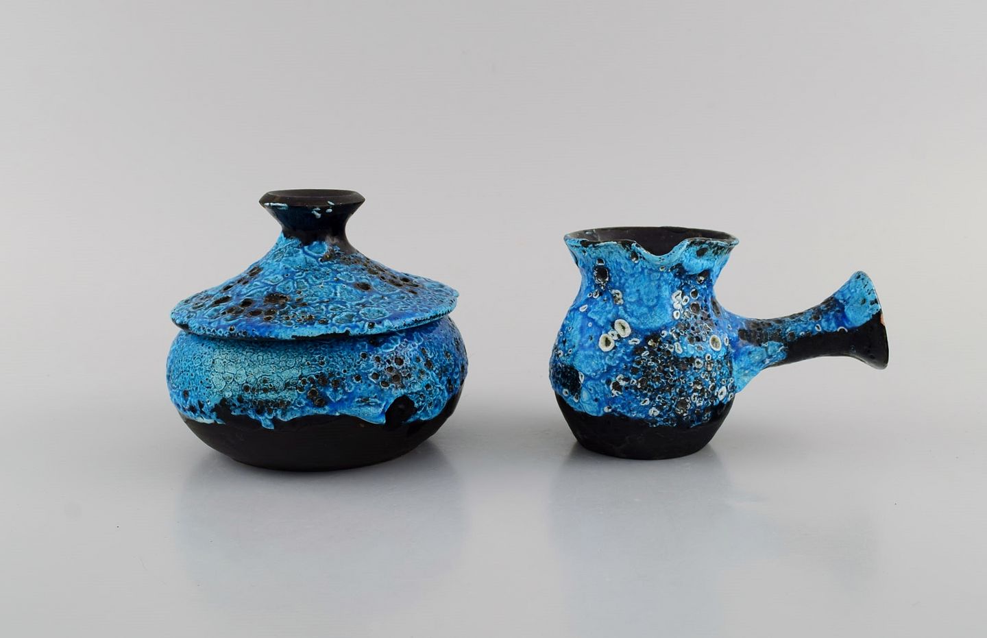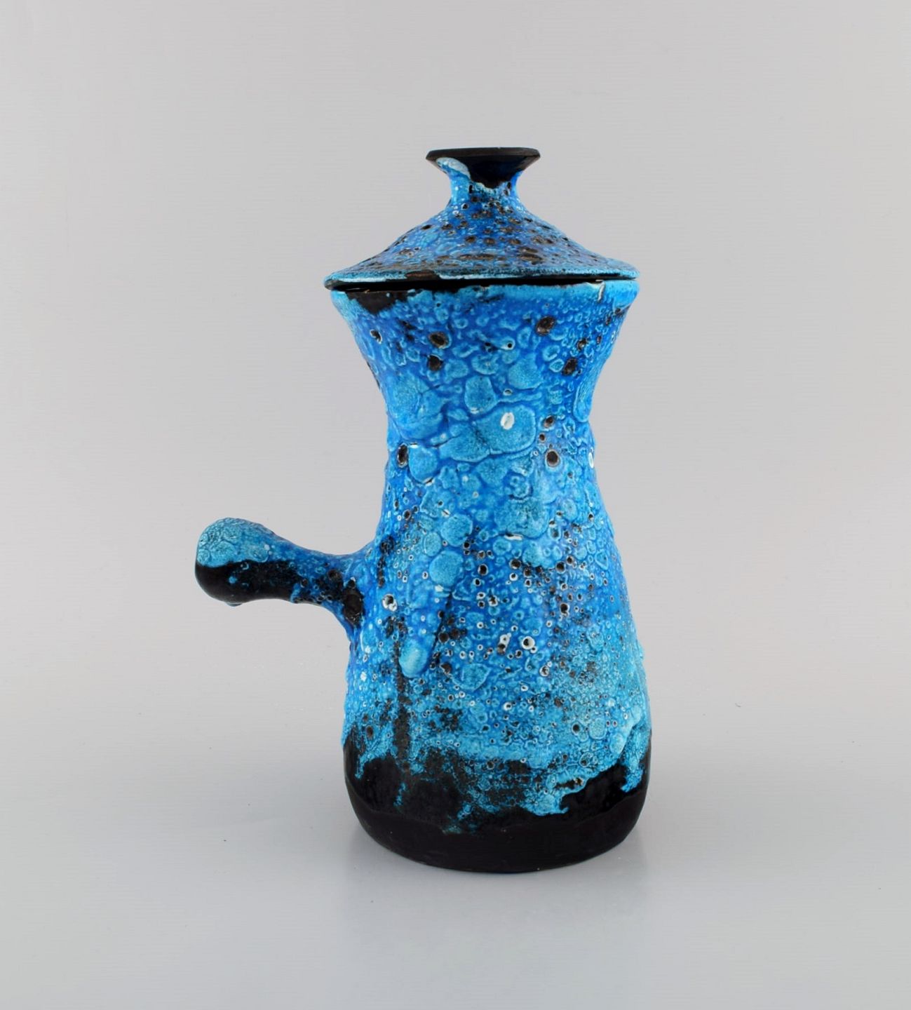 French ceramist. Unique coffee service in glazed stoneware. Beautiful glaze in light blue shades. Mid-20th century.