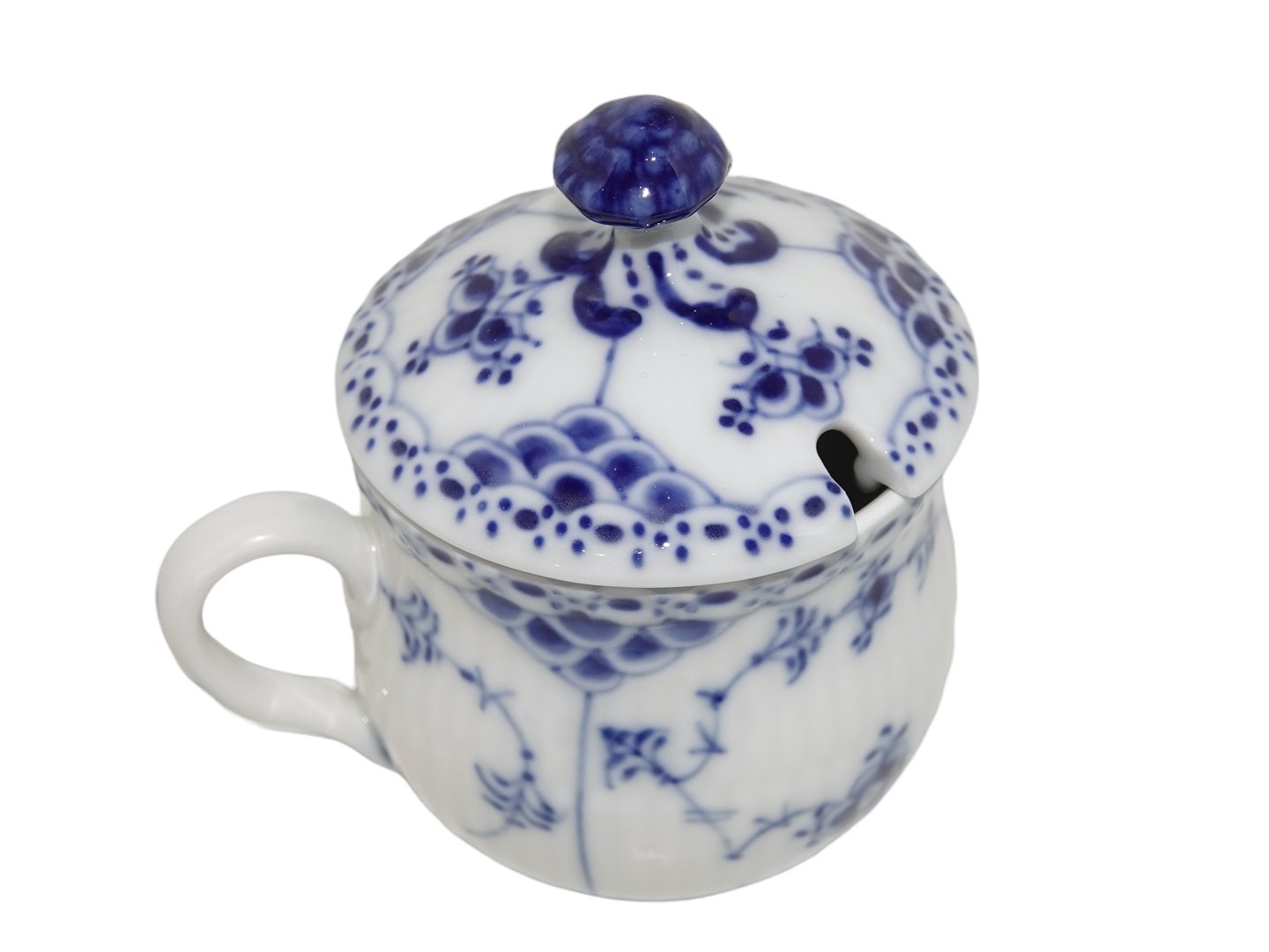 Royal Copenhagen Blue Fluted Half Lace, lidded mustard jar.