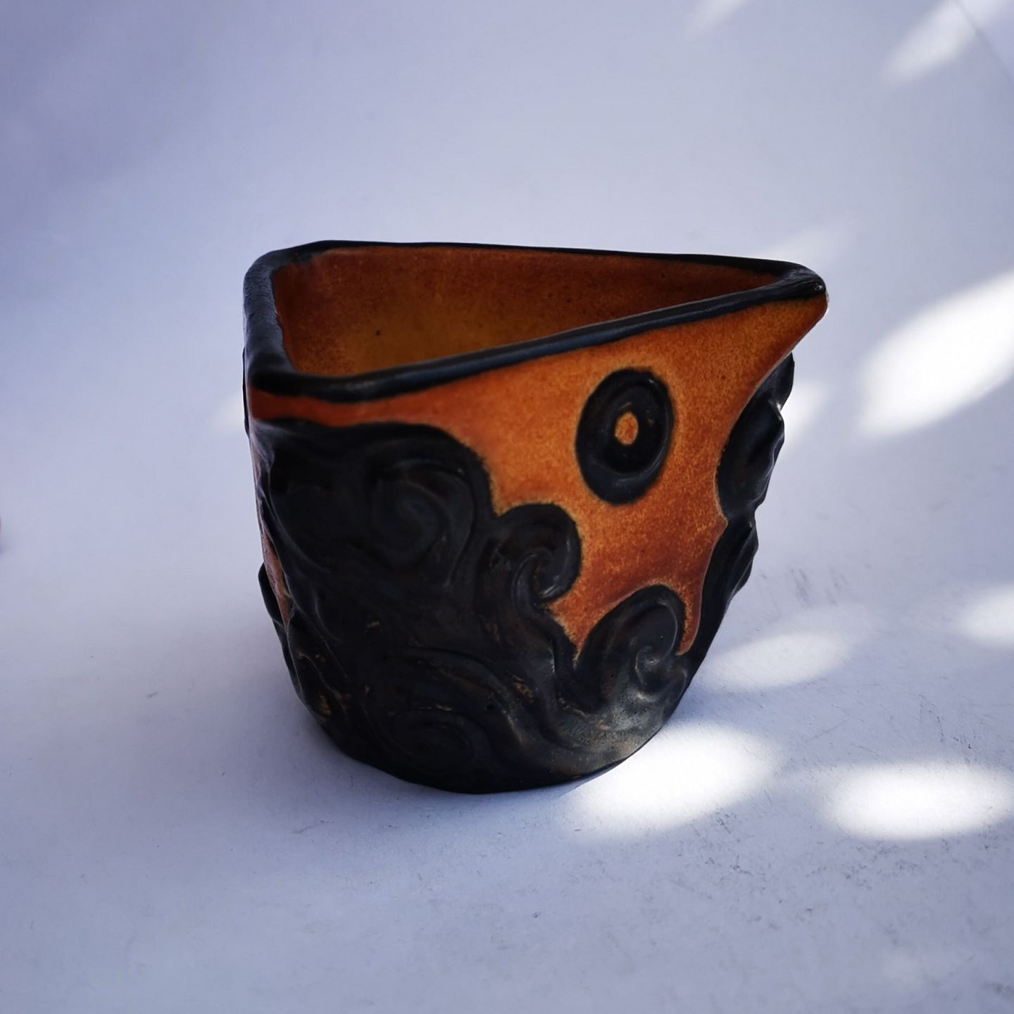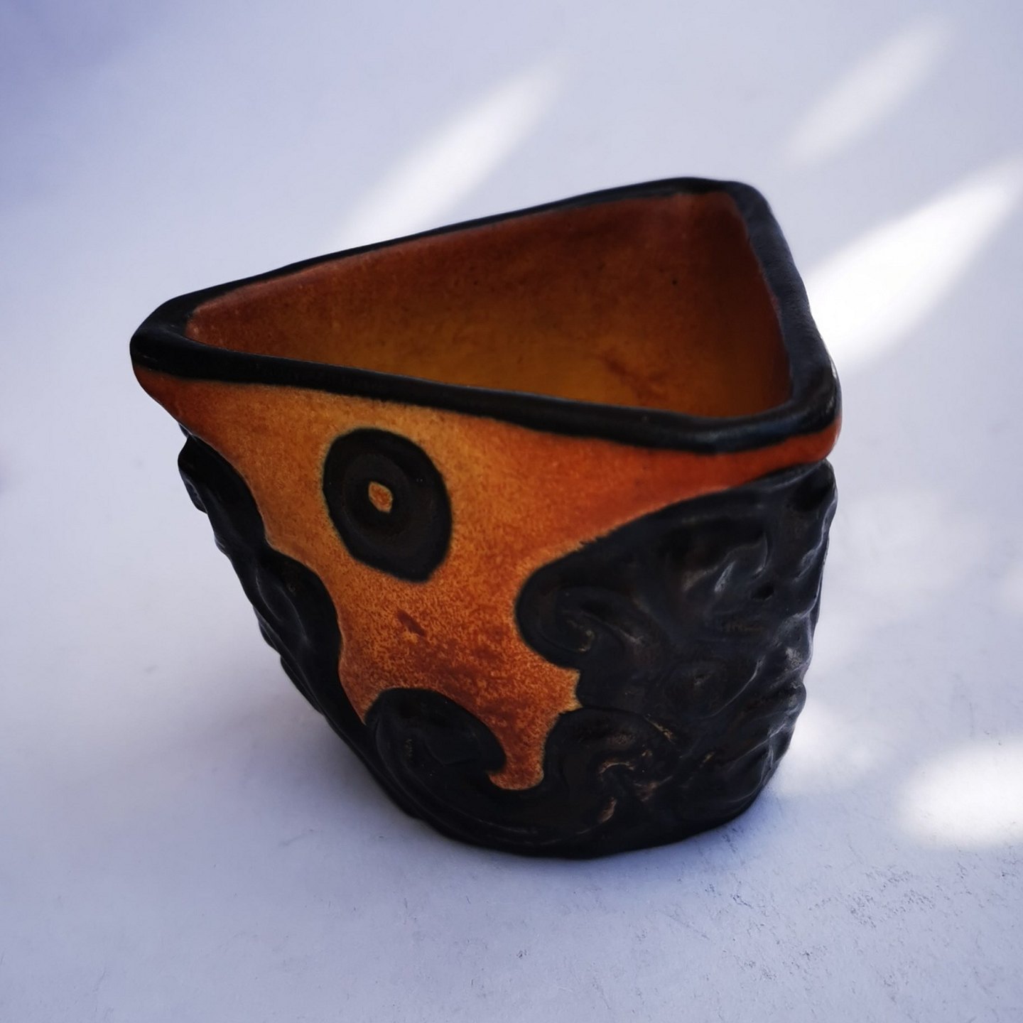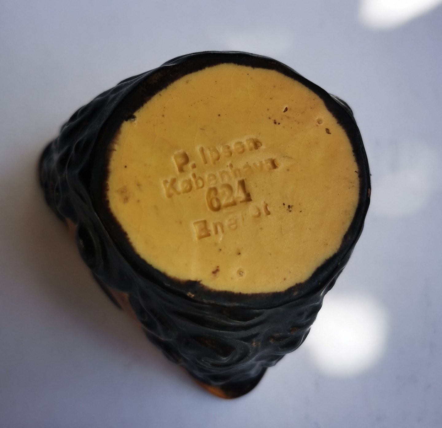 Trekantet vase fra Peter Ipsen fabrikken fra omkring 1900. Fremstår i perfekt stand uden skader eller reparationer. Stemplet med modelnummer 624 samt P. Ipsen, København. H. 6½ cm (2.55 inches).