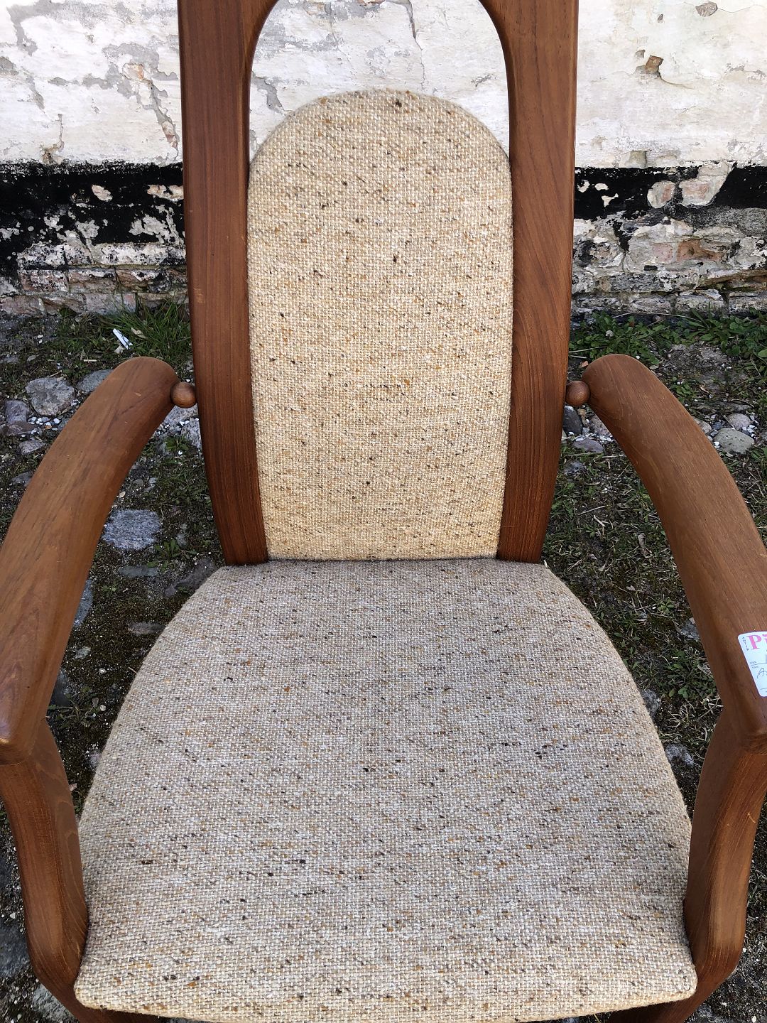 EMC Furniture højrykket armstol af massiv teaktræ betrukket med lys uld.