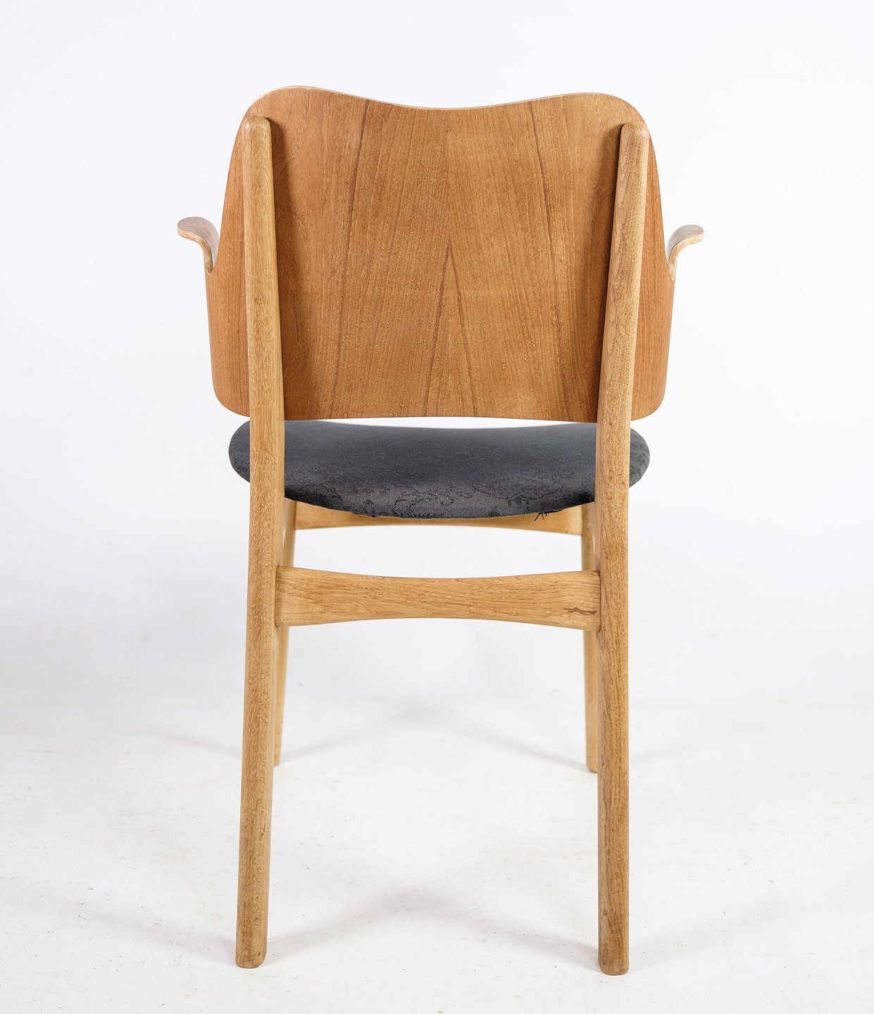 The chairs feature a unique combination of oak and teak, which adds to their distinctive appearance. The chairs are also upholstered in a branded blue fabric with a nice pattern, which complements the warm tones of the wood.