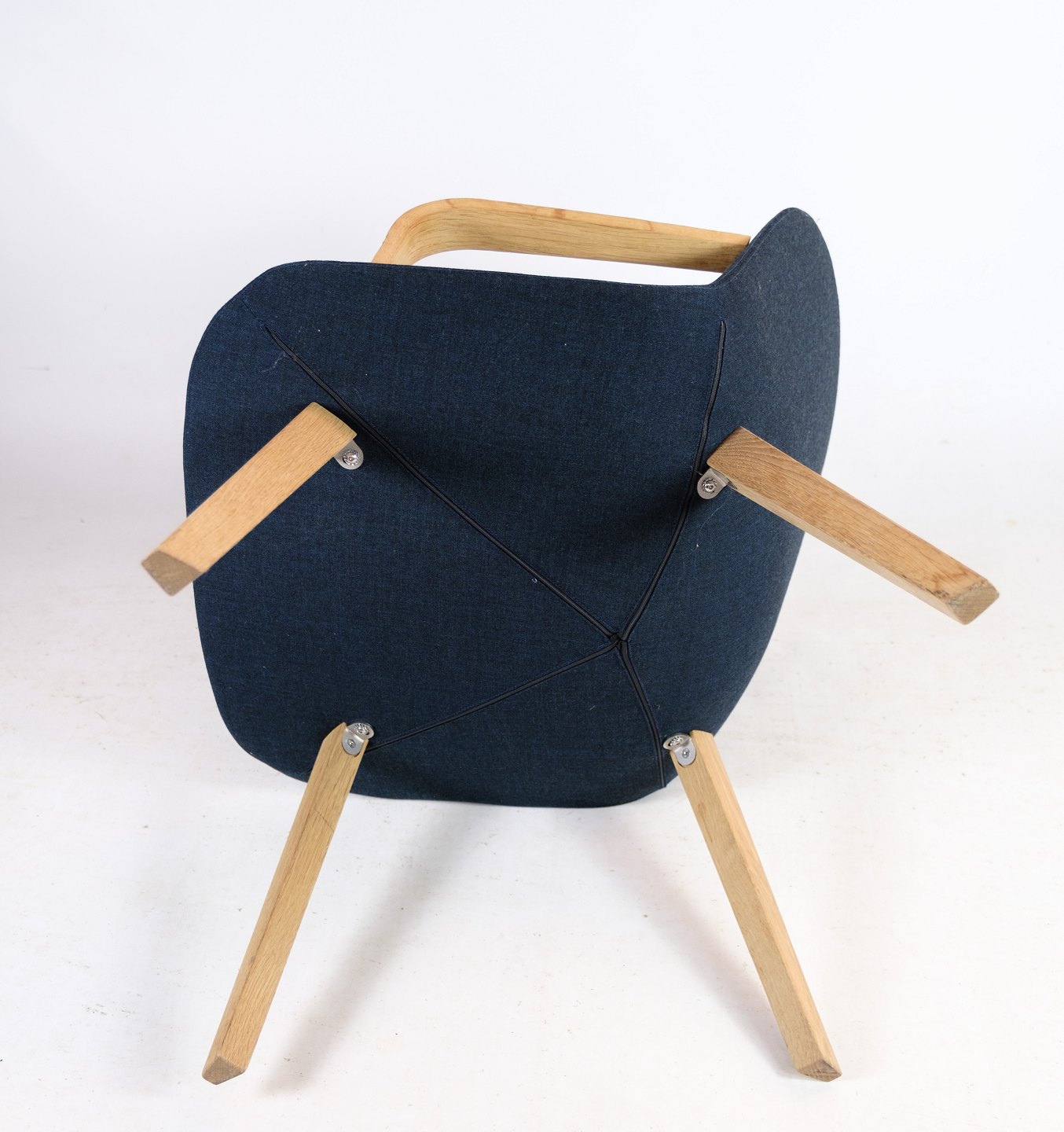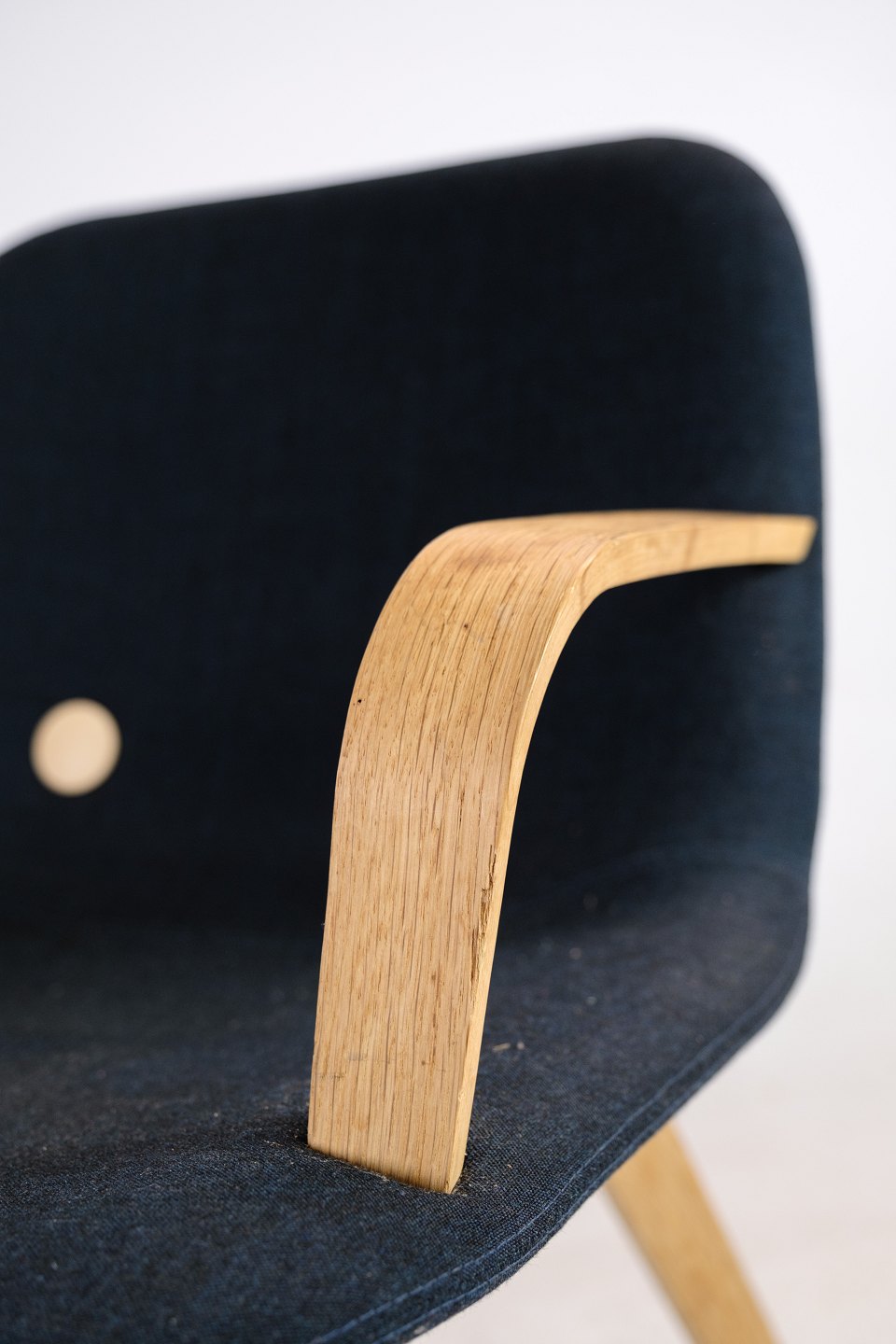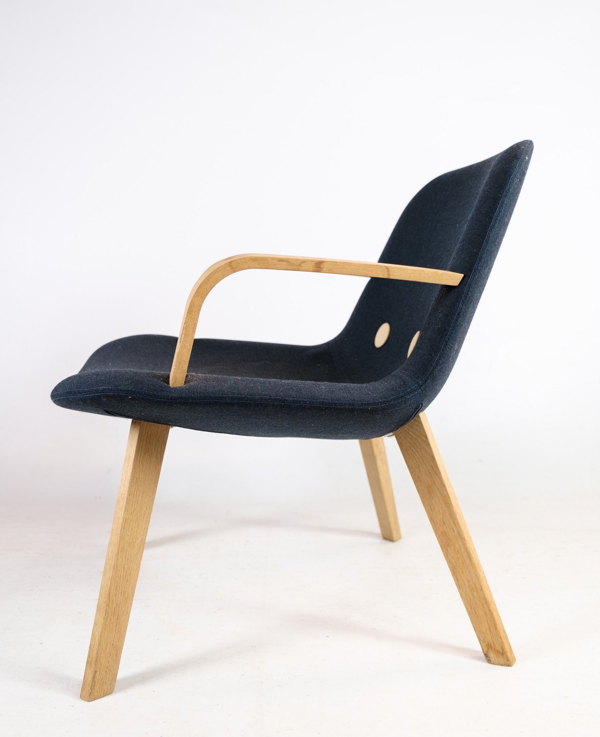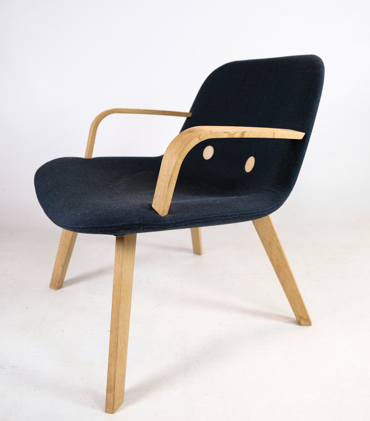 Lounge stol, model EJ 3, i egetræ med blåt uldstof lavet af Erik Jørgensen i forlængelse af Eyes-serien. Lounge versionen er lavere og dybere, som skaber en formidabel siddekomfort. Placer stolen i sofahjørnet, kontoret eller soveværelset.