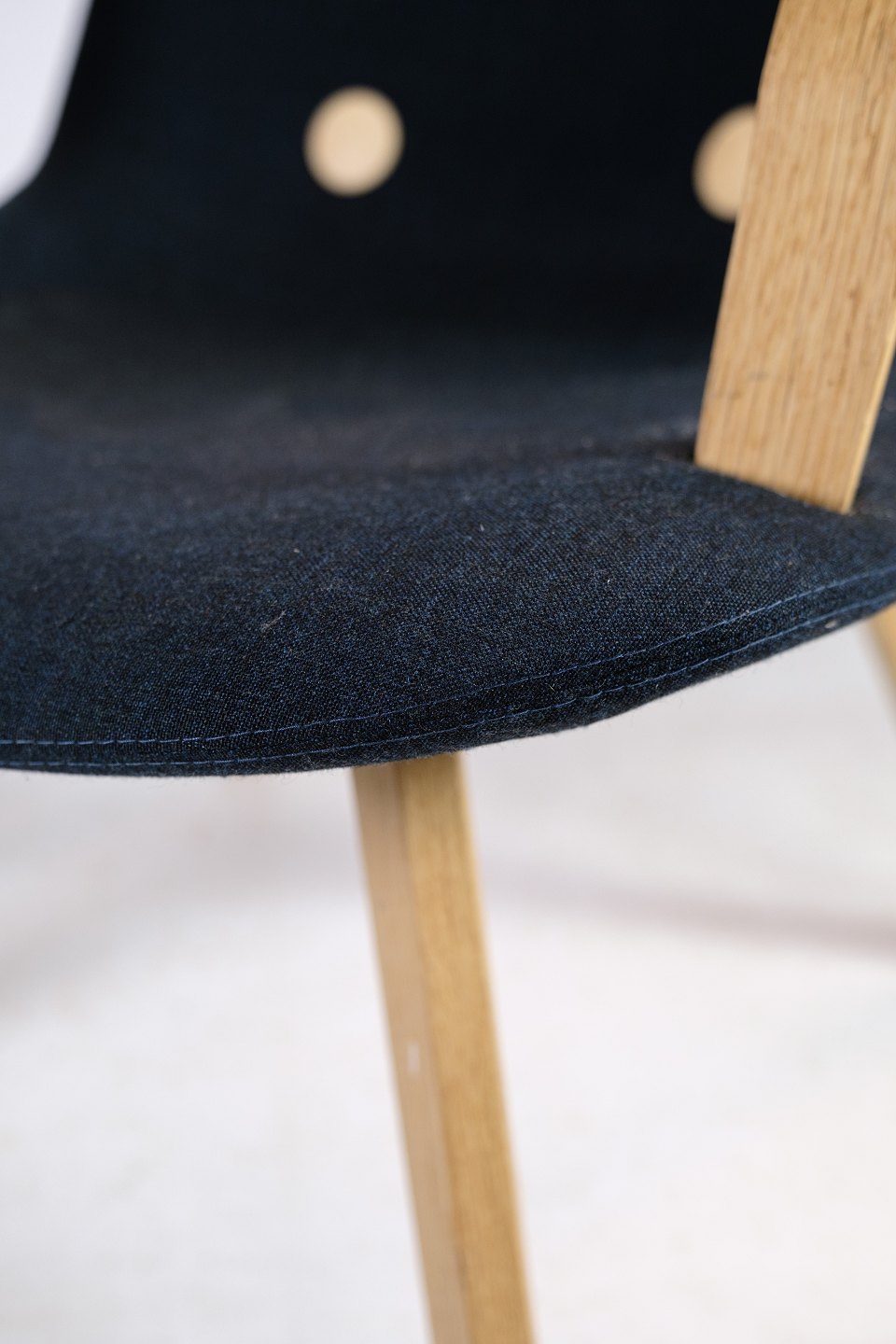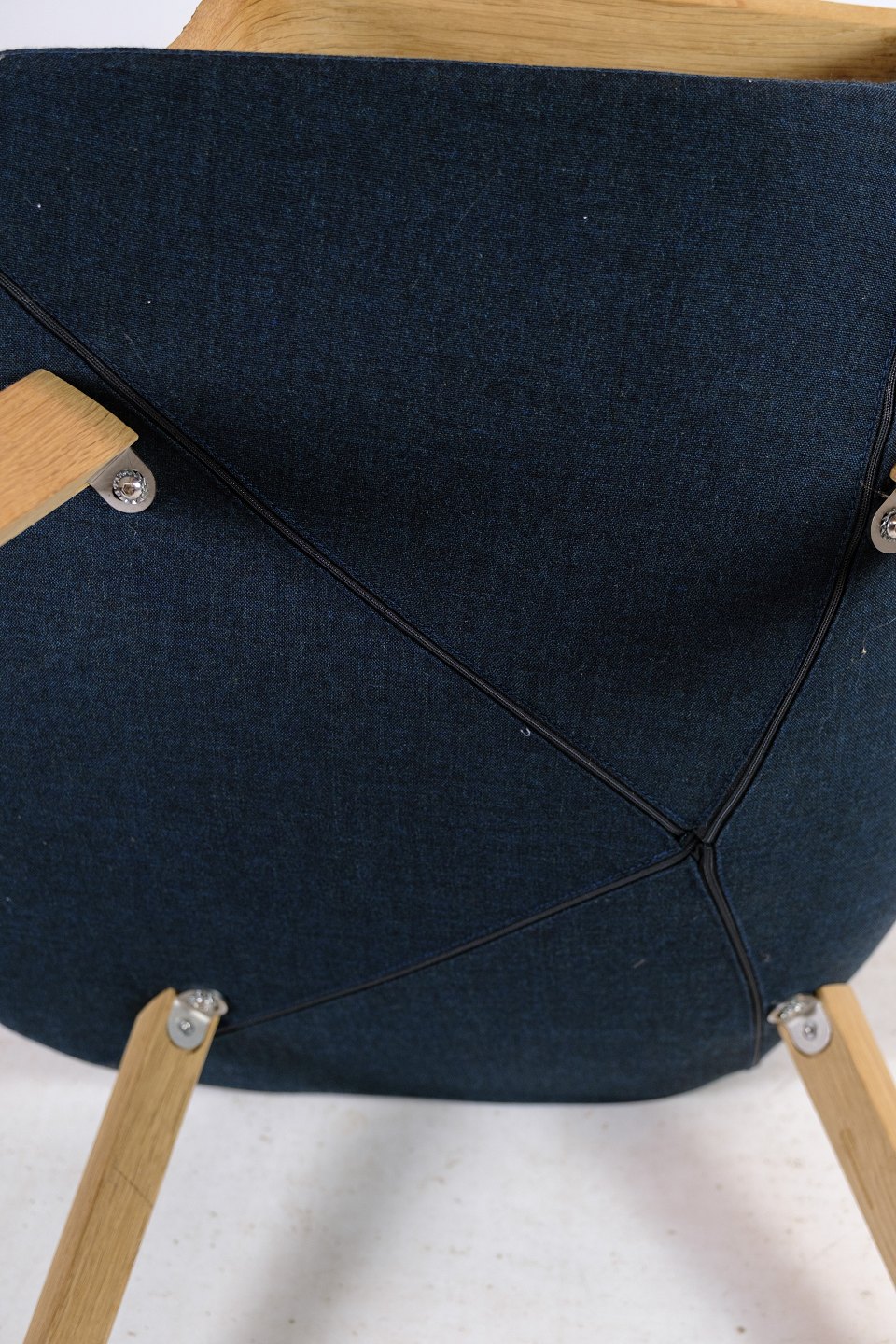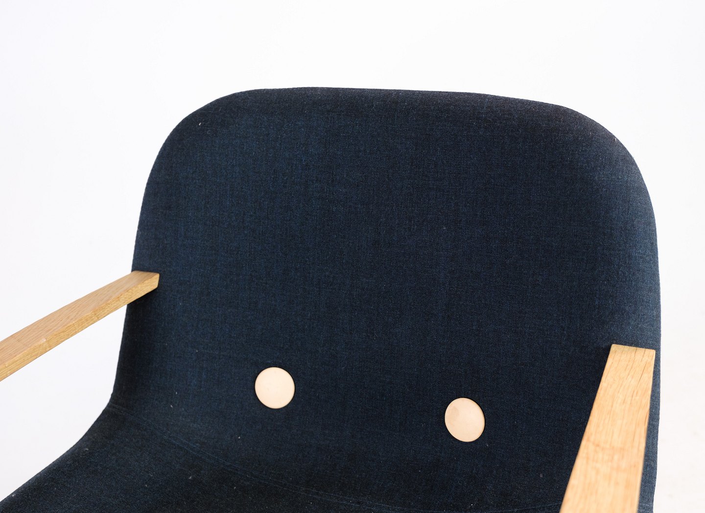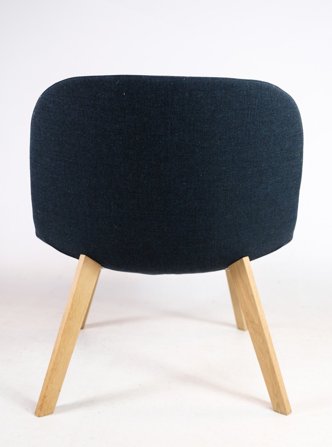 Lounge stol, model EJ 3, i egetræ med blåt uldstof lavet af Erik Jørgensen i forlængelse af Eyes-serien. Lounge versionen er lavere og dybere, som skaber en formidabel siddekomfort. Placer stolen i sofahjørnet, kontoret eller soveværelset.