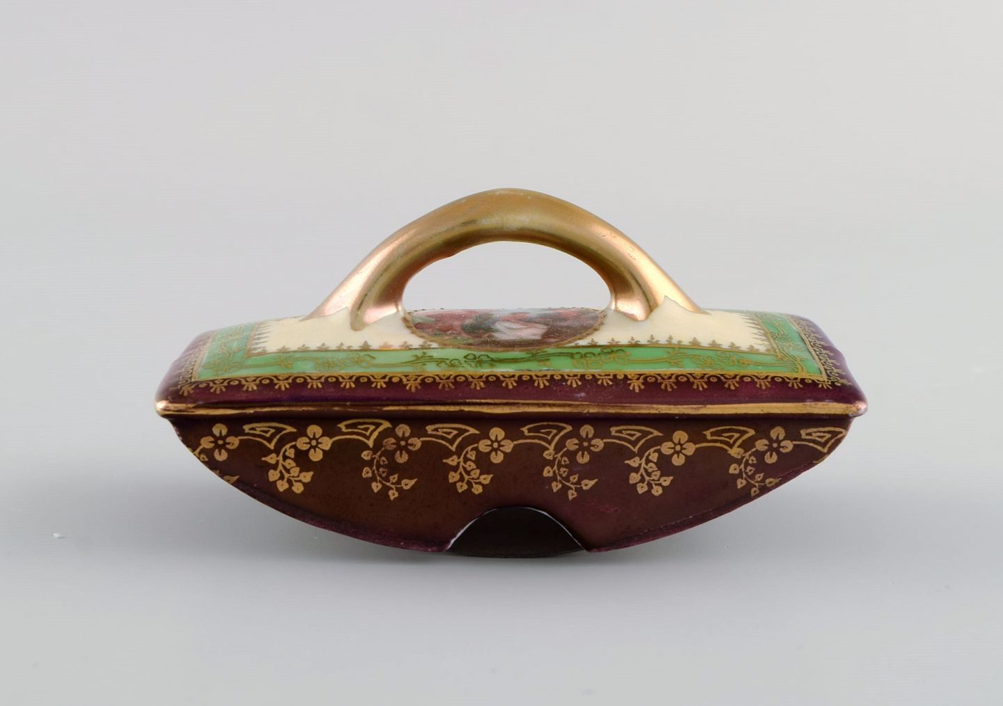 Two candlesticks and ink dryer in hand-painted porcelain. Romantic scenes and gold decoration. Vienna, early 20th century.