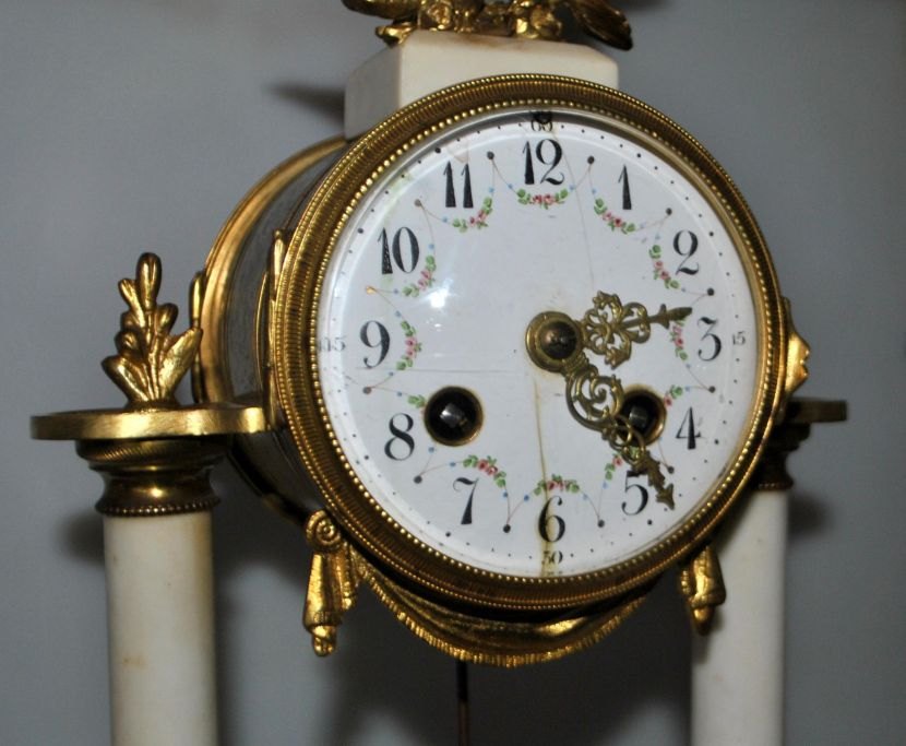 French bronze / marble column clock, 19th century. Top figure of two birds in nest. Columns and plinth of white marble. Dial in white enamel with floral vines. Disc with Arabic numerals. Standard movement. Stamped .: Th. Marti. Clockwise in bronze. H .: 36 cm. B .: 19.3 cm.