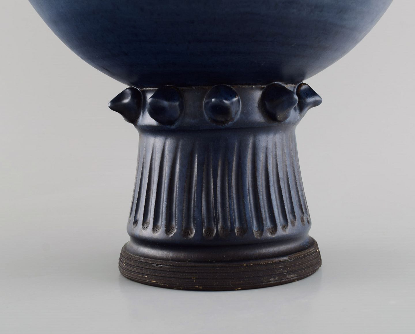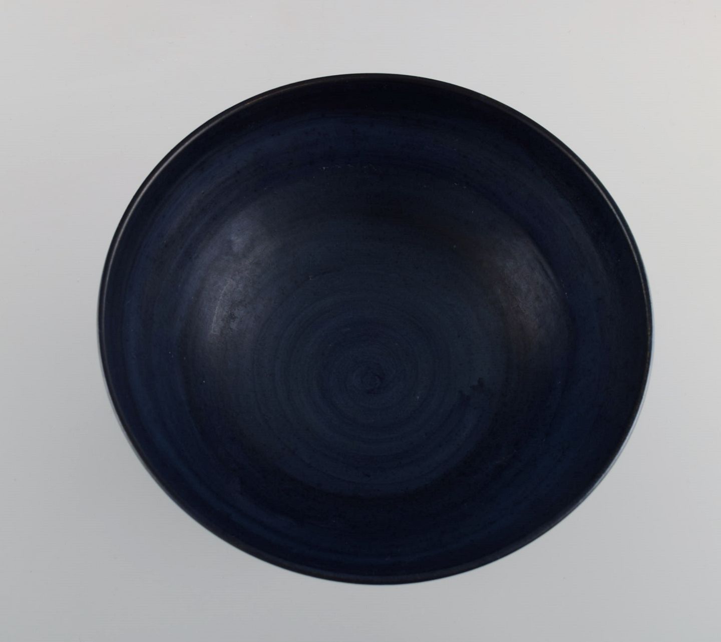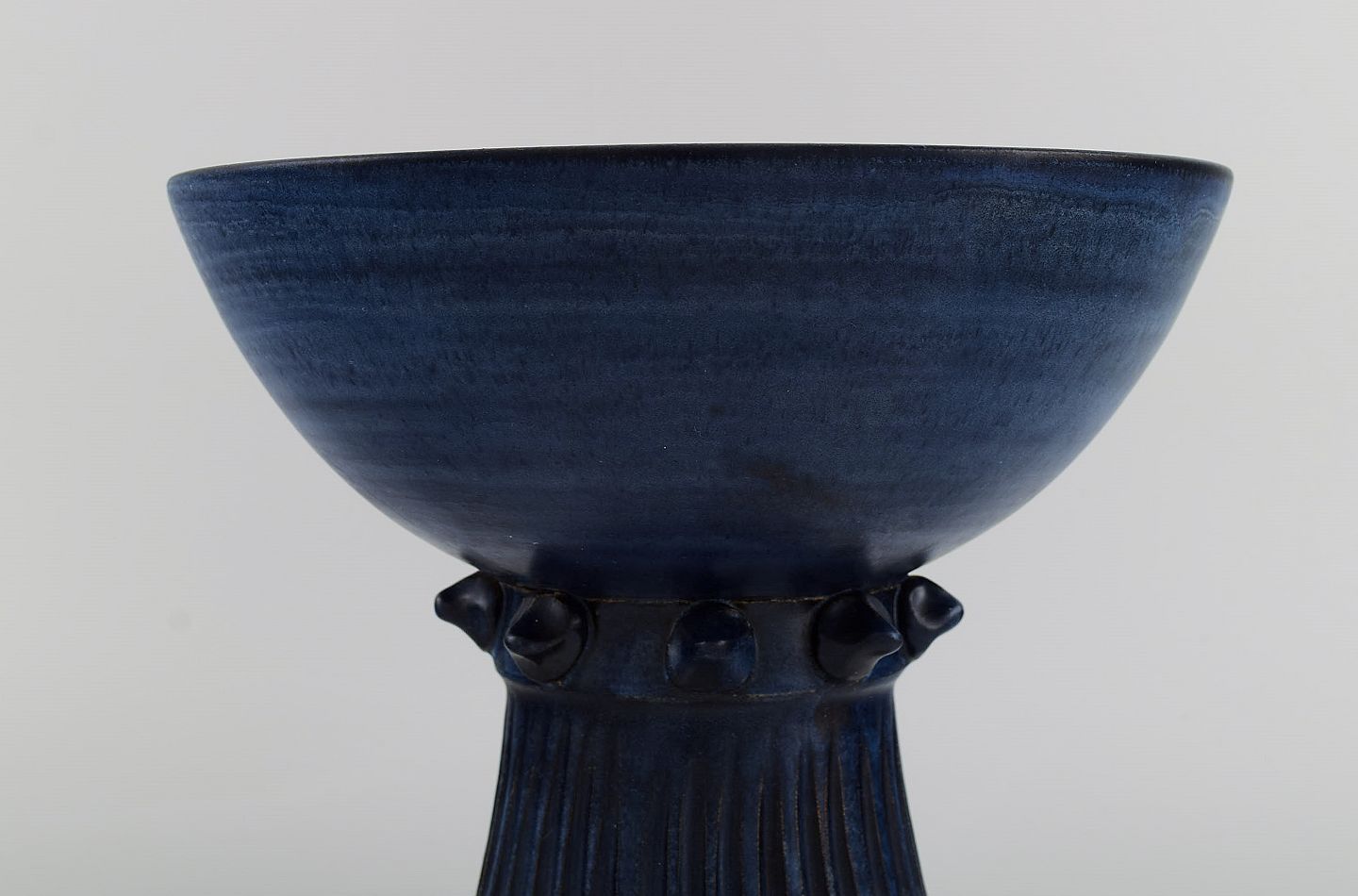 Irma Yourstone (1911-1988), Sverige. Skål på fod i glaseret stentøj. Smuk glasur i dybe blå nuancer. 1960'erne.