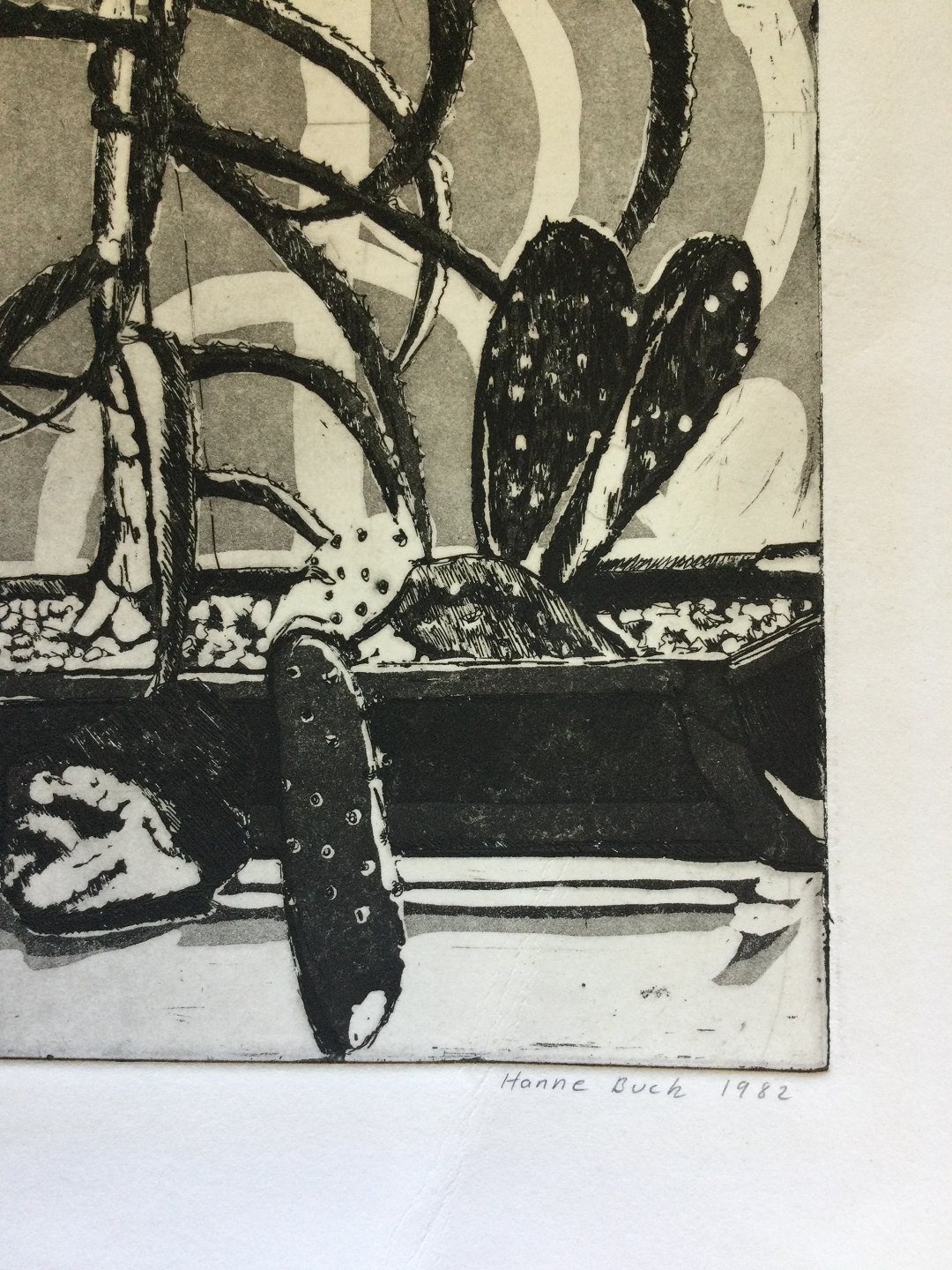 Akvatinte af Hanne Buch - Opstilling i vindue med kande og kaktus 1982.
