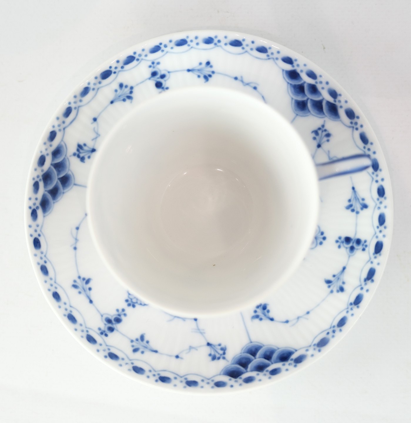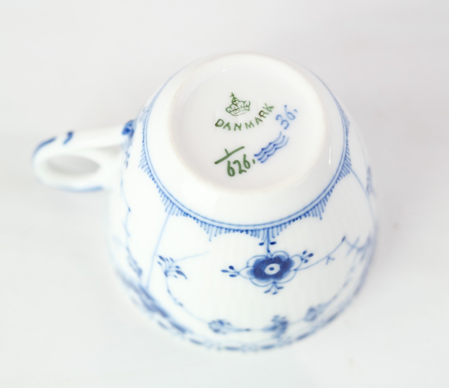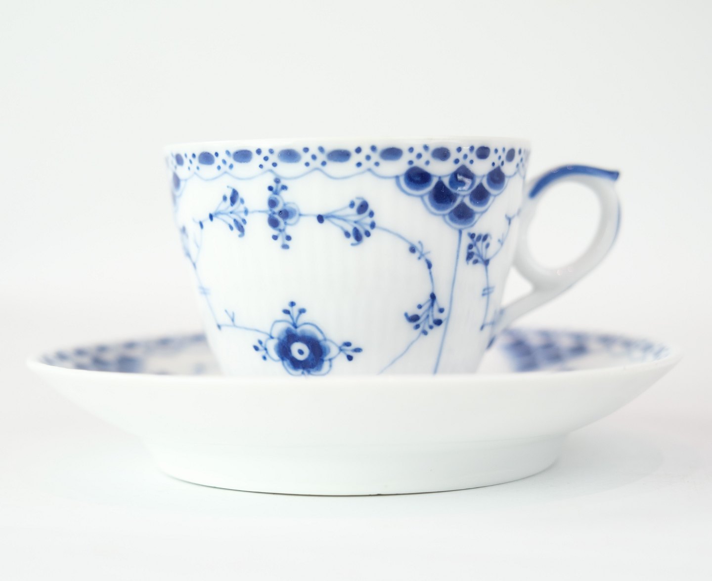 Musselmalet halvblonde kop med underkop fra en kongelig porcelænsfabrik.