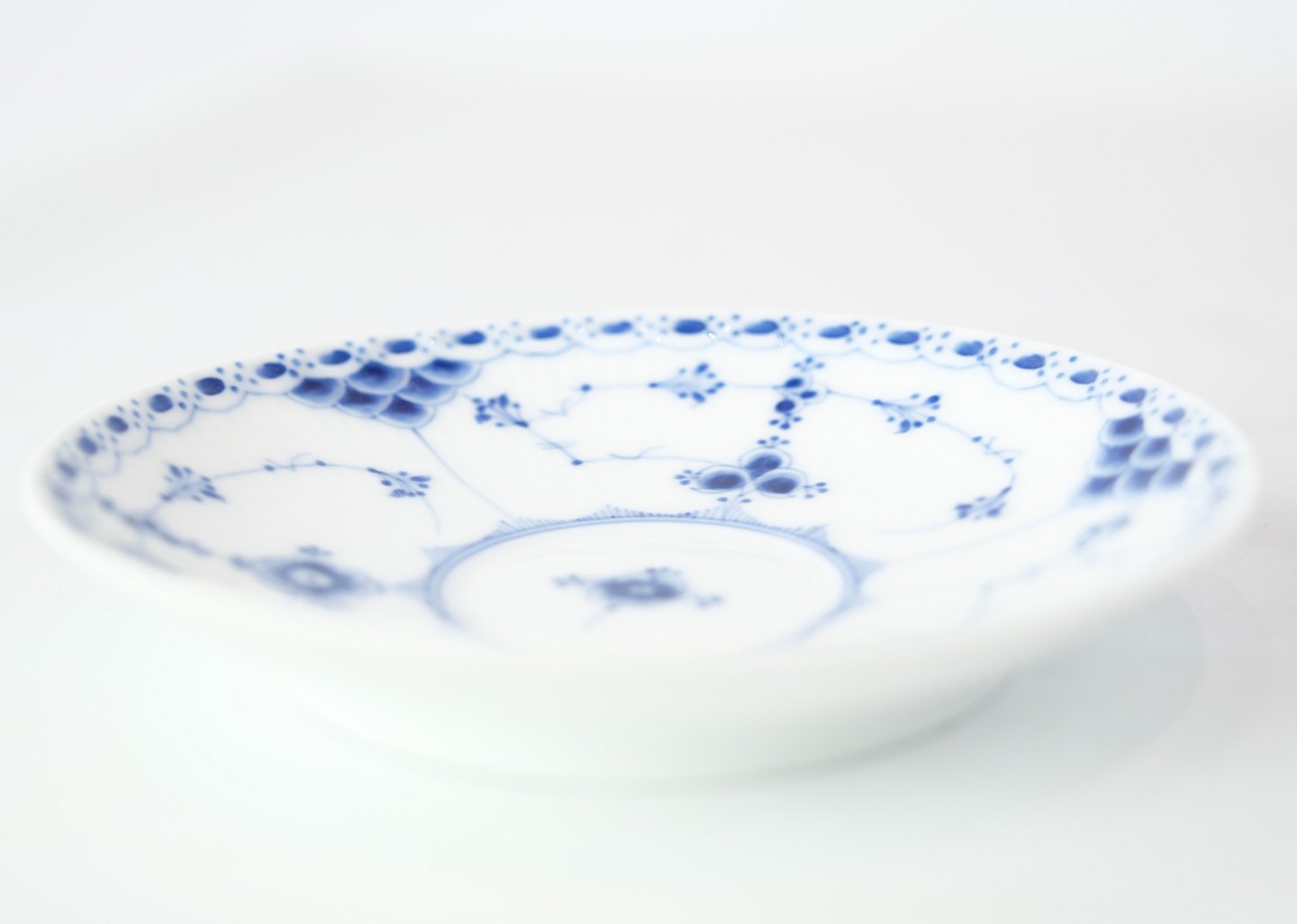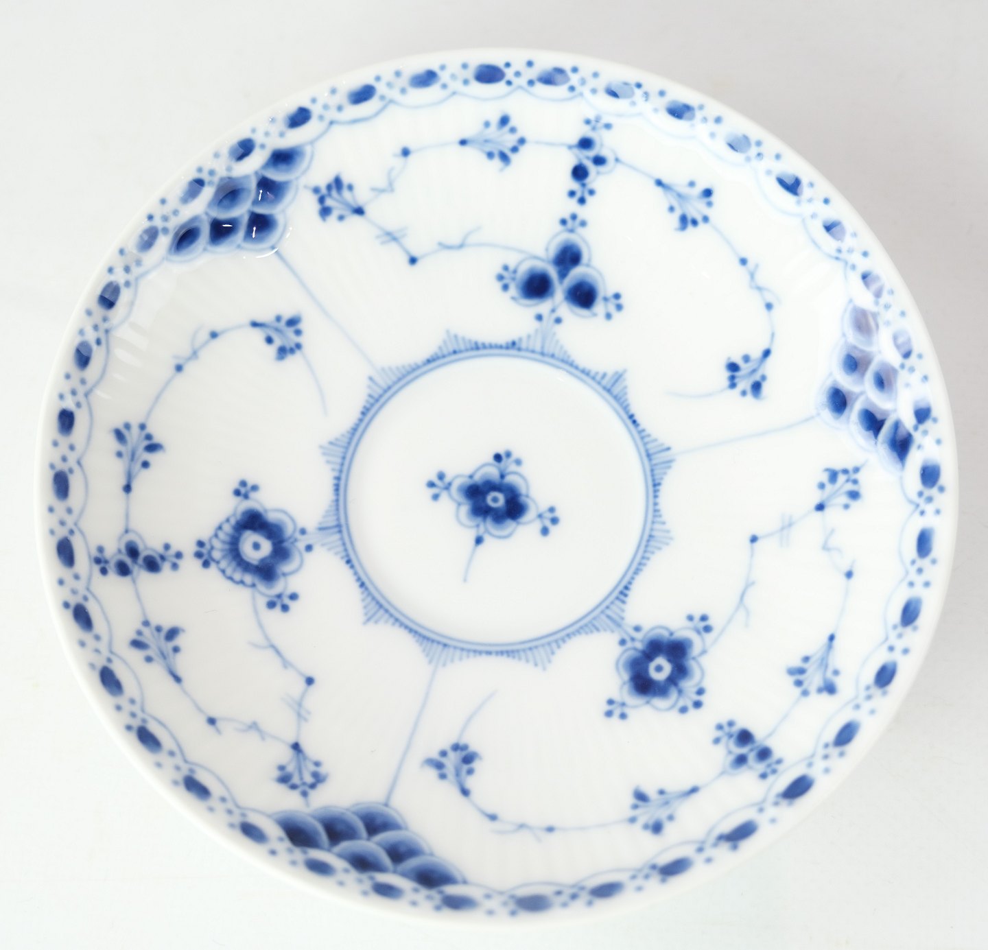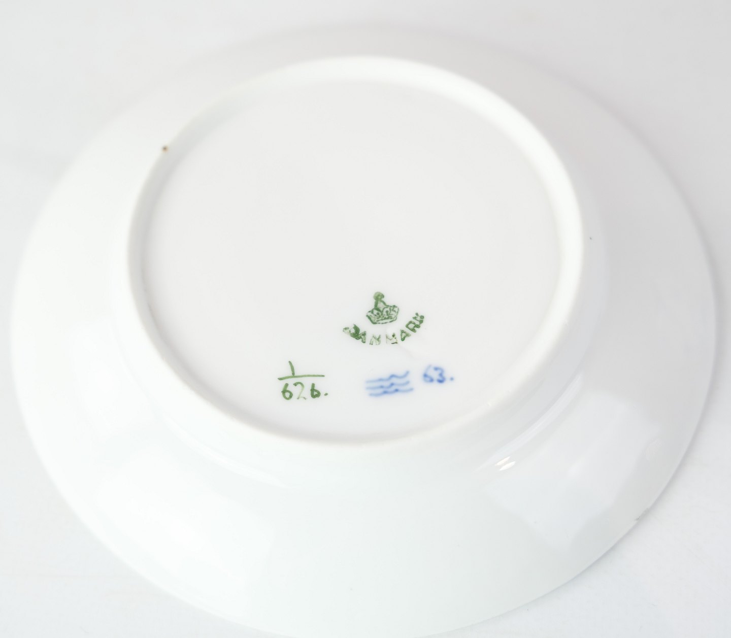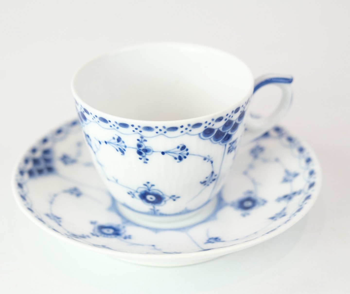 Musselmalet halvblonde kop med underkop fra en kongelig porcelænsfabrik.