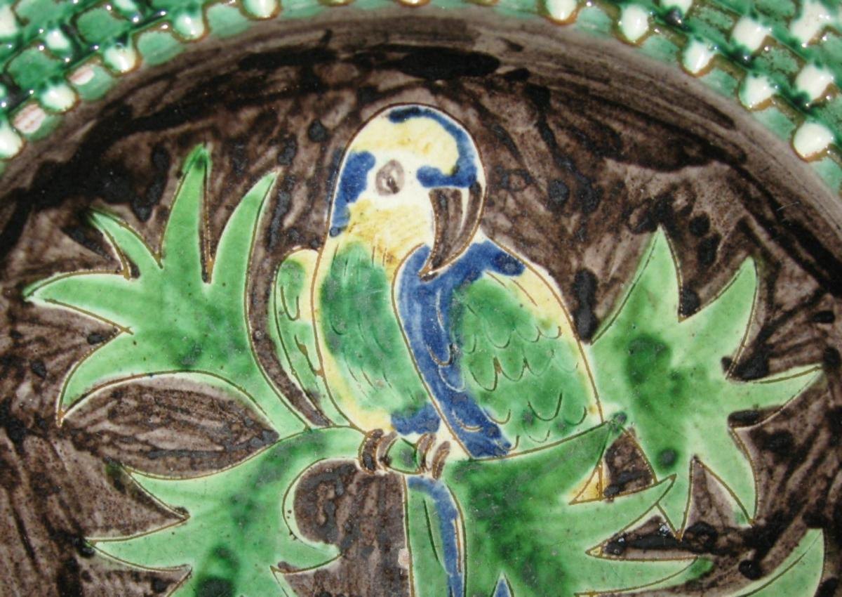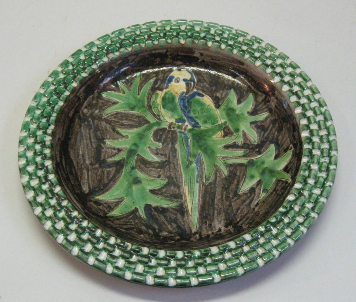 Ceramic dish, Humlebæk, Denmark. White base with liveries in brown, yellow, blue and green. Decorated with parrot in a tree. Rim is rippled. Dia .: 26.5 cm. Stamp: HK, Humlebæk, Denmark.