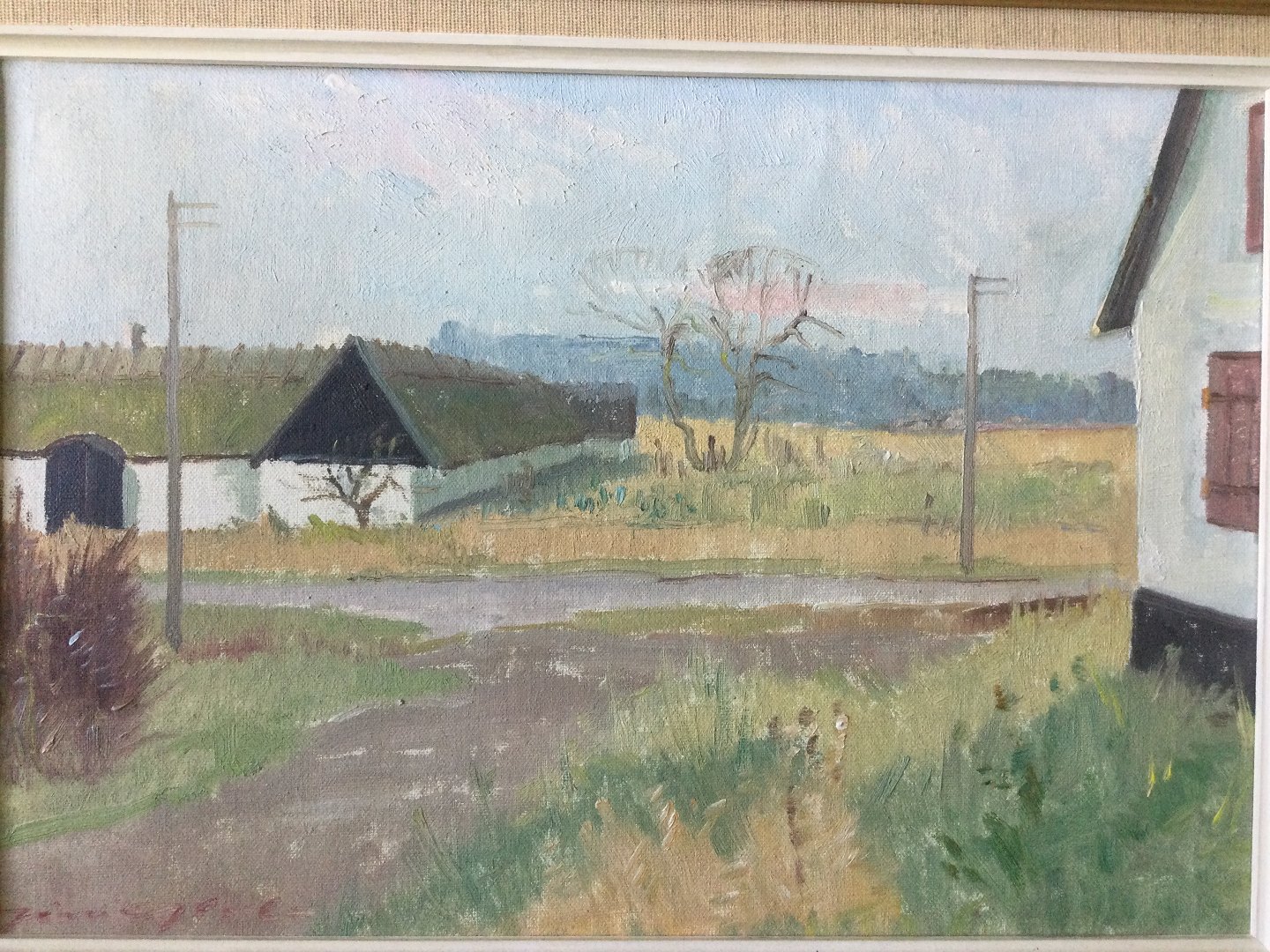 Maleri af Jørn Glob - Landskab med gård ved vej.