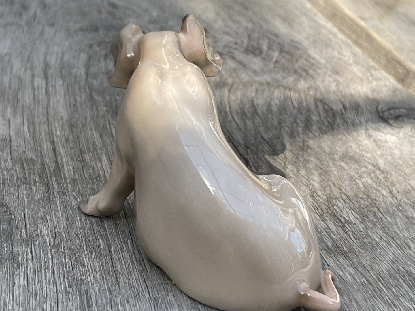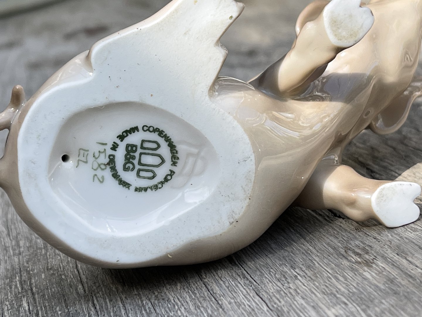 Siddende gris af porcelæn, formgivet af Dahl Jensen for Bing & Grøndahl, form nr. 1582. Signeret DJ i monogram. 2. sortering.