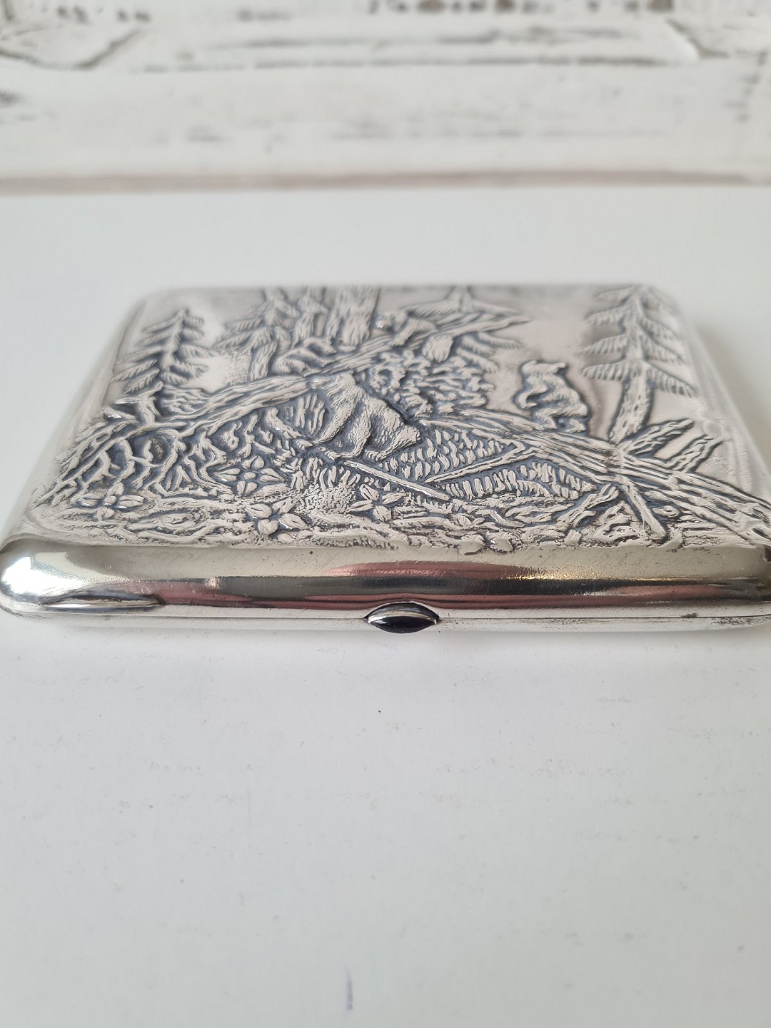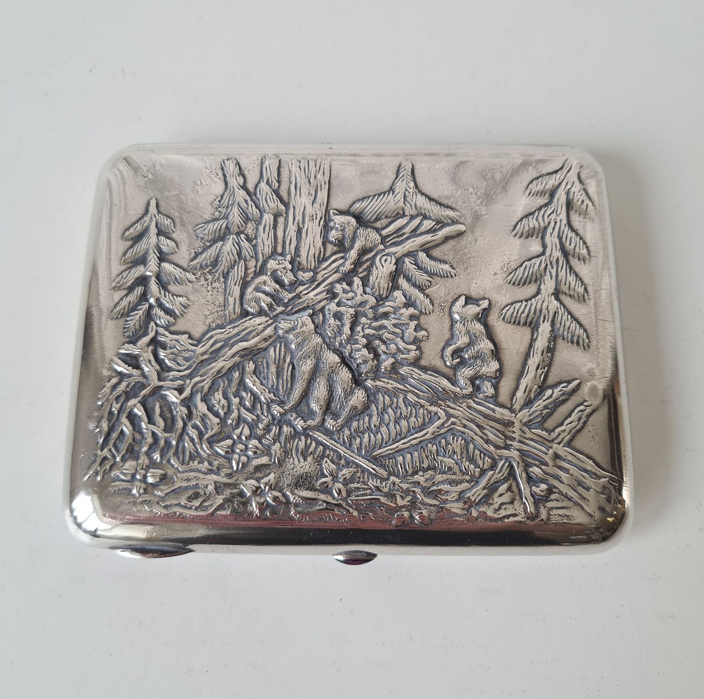 Russisk cigaret etui i sølv dekoreret med skovparti med fem bjørne